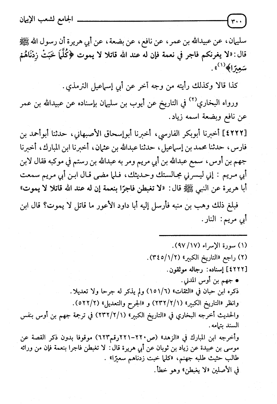 4222 - أَخْبَرَنَا أَبُو بَكْرٍ الْفَارِسِيُّ، أَخْبَرَنَا أَبُو إِسْحَاقَ الْأَصْبَهَانِيُّ، حَدَّثَنَا أَبُو أَحْمَدَ بْنُ فَارِسٍ، حَدَّثَنَا مُحَمَّدُ بْنُ إِسْمَاعِيلَ، حَدَّثَنَا عَبْدُ اللهِ بْنُ عُثْمَانَ أخبرنا ابْنُ الْمُبَارَكِ، أَخْبَرَنَا جَهْمُ بْنُ أَوْسٍ، سَمِعَ عَبْدَ اللهِ بْنَ أَبِي مَرْيَمَ، وَمَرَّ بِهِ عَبْدُ اللهِ بْنُ رُسْتُمٍ فِي مَوْكِبِهِ، فَقَالَ لِابْنِ أَبِي مَرْيَمَ: إِنِّي لَيَسُرُّنِي مُجَالَسَتُكَ وَحَدِيثُكَ. فَلَمَّا مَضَى قَالَ ابْنُ أَبِي مَرْيَمَ: سَمِعْتُ أَبَا هُرَيْرَةَ، عَنِ النَّبِيِّ صَلَّى اللَّهُ عَلَيْهِ وَسَلَّمَ، قَالَ: " §لَا تَغْبِطَنَّ فَاجِرًا بِنِعْمَةٍ، إِنَّ لَهُ عِنْدَ اللهِ قَاتلًا لَا يَمُوتُ ". فَبَلَغَ ذَلِكَ وَهْبَ بْنَ مُنَبِّهٍ، فَأَرْسَلَ إِلَيْهِ أَبَا دَاوُدَ الْأَعْوَرَ: مَا قَاتلًا لَا يَمُوتُ؟ قَالَ ابْنُ أَبِي مَرْيَمَ: " النَّارُ "