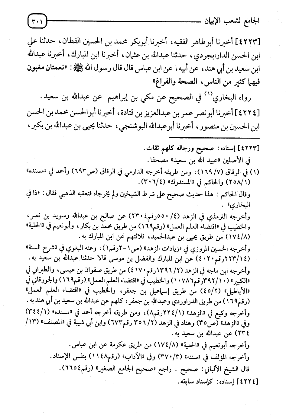 4223 - أَخْبَرَنَا أَبُو طَاهِرٍ الْفَقِيهُ، أَخْبَرَنَا أَبُو بَكْرٍ مُحَمَّدُ بْنُ الْحُسَيْنِ الْقَطَّانُ، حَدَّثَنَا عَلِيُّ بْنُ الْحَسَنِ الدَّارَابَجِرْدِيُّ، حَدَّثَنَا عَبْدُ اللهِ بْنُ عُثْمَانَ، أَخْبَرَنَا ابْنُ الْمُبَارَكِ، أَخْبَرَنَا عَبْدُ اللهِ بْنُ سَعِيدِ بْنِ أَبِي هِنْدَ، عَنْ أَبِيهِ، عَنِ ابْنِ عَبَّاسٍ، قَالَ: قَالَ رَسُولُ اللهِ صَلَّى اللَّهُ عَلَيْهِ وَسَلَّمَ: " §نِعْمَتَانِ مَغْبُونٌ فِيهِمَا كَثِيرٌ مِنَ النَّاسِ: الصِّحَّةُ، وَالْفَرَاغُ ". رَوَاهُ الْبُخَارِيُّ فِي الصَّحِيحِ، عَنْ مَكِّيِّ بْنِ إِبْرَاهِيمَ، عَنْ عَبْدِ اللهِ بْنِ سَعِيدٍ