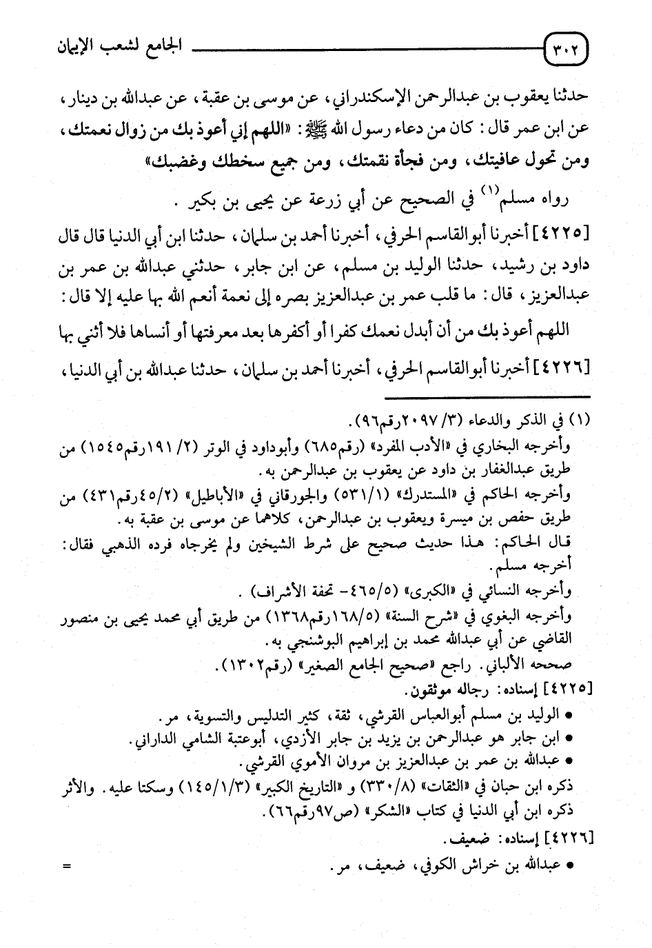 4225 - أَخْبَرَنَا أَبُو الْقَاسِمِ الْحرَفيُّ، أَخبرنا أَحْمَدُ بْنُ سَلْمَانَ، حَدَّثَنَا ابْنُ أَبِي الدُّنْيَا، قَالَ: قَالَ دَاوُدُ بْنُ رُشَيْدٍ: حَدَّثَنَا الْوَلِيدُ بْنُ مُسْلِمٍ، عَنِ ابْنِ جَابِرٍ، حَدَّثَنِي عَبْدُ اللهِ بْنُ عُمَرَ بْنِ عَبْدِ الْعَزِيزِ، قَالَ: " مَا قَلَّبَ عُمَرُ بْنُ عَبْدِ الْعَزِيزِ بَصَرَهُ إِلَى نِعْمَةٍ أَنْعَمَ اللهُ بِهَا عَلَيْهِ إِلَّا قَالَ: §اللهُمَّ أَعُوذُ بِكَ أَنْ أُبَدِّلَ نِعْمَتَكَ كُفْرًا، أَوْ أَكْفُرَهَا بَعْدَ مَعْرِفَتِهَا، أَوْ أَنْسَاهَا فَلَا أُثْنِيَ بِهَا "