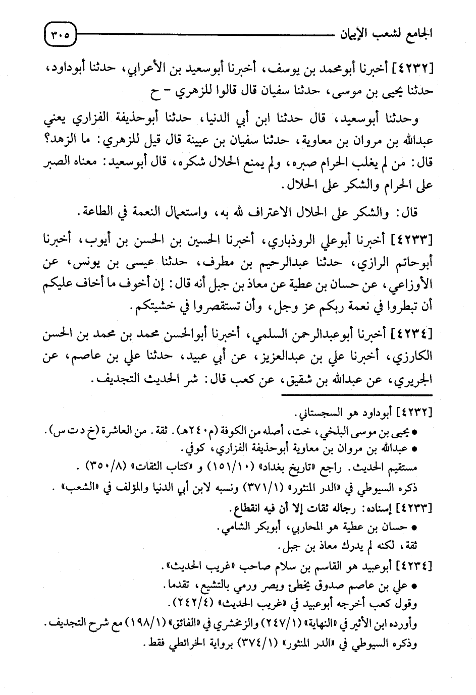 4232 - أَخْبَرَنَا أَبُو مُحَمَّدِ بْنُ يُوسُفَ، أَخْبَرَنَا أَبُو سَعِيدِ بْنِ الْأَعْرَابِيُّ، حَدَّثَنَا أَبُو دَاوُدَ، حَدَّثَنَا يَحْيَى بْنُ مُوسَى، حَدَّثَنَا سُفْيَانُ، قَالَ: قَالُوا لِلزُّهْرِيِّ: ح، وَحَدَّثَنَا أَبُو سَعِيدٍ، قَالَ: حدثنا ابْنُ أَبِي الدُّنْيَا، حَدَّثَنَا أَبُو حُذَيْفَةَ الْفَزَارِيُّ يَعْنِي عَبْدَ اللهِ بْنَ مَرْوَانَ بْنِ مُعَاوِيَةَ، حَدَّثَنَا سُفْيَانُ بْنُ عُيَيْنَةَ، قَالَ: قِيلَ لِلزُّهْرِيِّ: مَا §الزُّهْدُ؟ قَالَ: " مَنْ لَمْ يَغْلِبِ الْحَرَامُ صَبْرَهُ، وَلَمْ يَمْنَعِ الْحَلَالُ شُكْرَهُ ". قَالَ أَبُو سَعِيدٍ: " مَعْنَاهُ الصَّبْرُ عَلَى الْحَرَامِ وَالشُّكْرُ عَلَى الْحَلَالِ ". قَالَ: " وَالشُّكْرُ عَلَى الْحَلَالِ الِاعْتِرَافُ لِلَّهِ بِهِ، وَاسْتِعْمَالُ النِّعْمَةِ فِي الطَّاعَةِ "