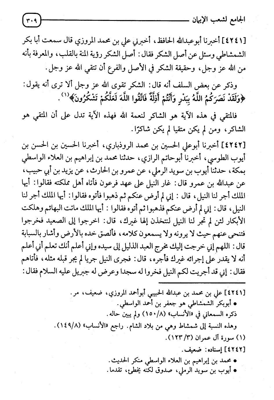 4241 - أَخْبَرَنَا أَبُو عَبْدِ اللهِ الْحَافِظُ، أَخْبَرَنِي عَلِيُّ بْنُ مُحَمَّدٍ الْمَرْوَزِيُّ، قَالَ: سَمِعْتُ أَبَا بَكْرٍ الشِّمشَاطِيَّ، وَسُئِلَ عَنْ أَصْلِ الشُّكْرِ، فَقَالَ: " §أَصْلُ الشُّكْرِ رُؤْيَةُ الْمِنَّةِ بِالْقَلْبِ، وَالْمَعْرِفَةُ بِأَنَّهُ مِنَ اللهِ عَزَّ وَجَلَّ، وَحَقِيقَةُ الشُّكْرِ فِي الْأَصْلِ، وَالْفَرْعِ أَنْ تَتَّقِي اللهَ عز وجل وَذُكِرَ عَنْ بَعْضِ السَّلَفِ أَنَّهُ قَالَ: الشُّكْرُ تَقْوَى اللهِ عَزَّ وَجَلَّ. أَلَا تَرَى أَنَّهُ يَقُولُ: {وَلَقَدْ نَصَرَكُمُ اللهُ بِبَدْرٍ وَأَنْتُمْ أَذِلَّةٌ فَاتَّقُوا اللهَ لَعَلَّكُمْ تَشْكُرُونَ} [آل عمران: 123] فَالْمُتَّقِي فِي هَذِهِ الْآيَةِ هُوَ الشَّاكِرُ لِنِعْمَةِ اللهِ فهَذِهِ الْآيَةُ تَدُلُّ عَلَى أَنَّ الْمُتَّقِي هُوَ الشَّاكِرُ، وَمَنْ لَمْ يَكُنْ مُتَّقِيًا لَمْ يَكُنْ شَاكِرًا "