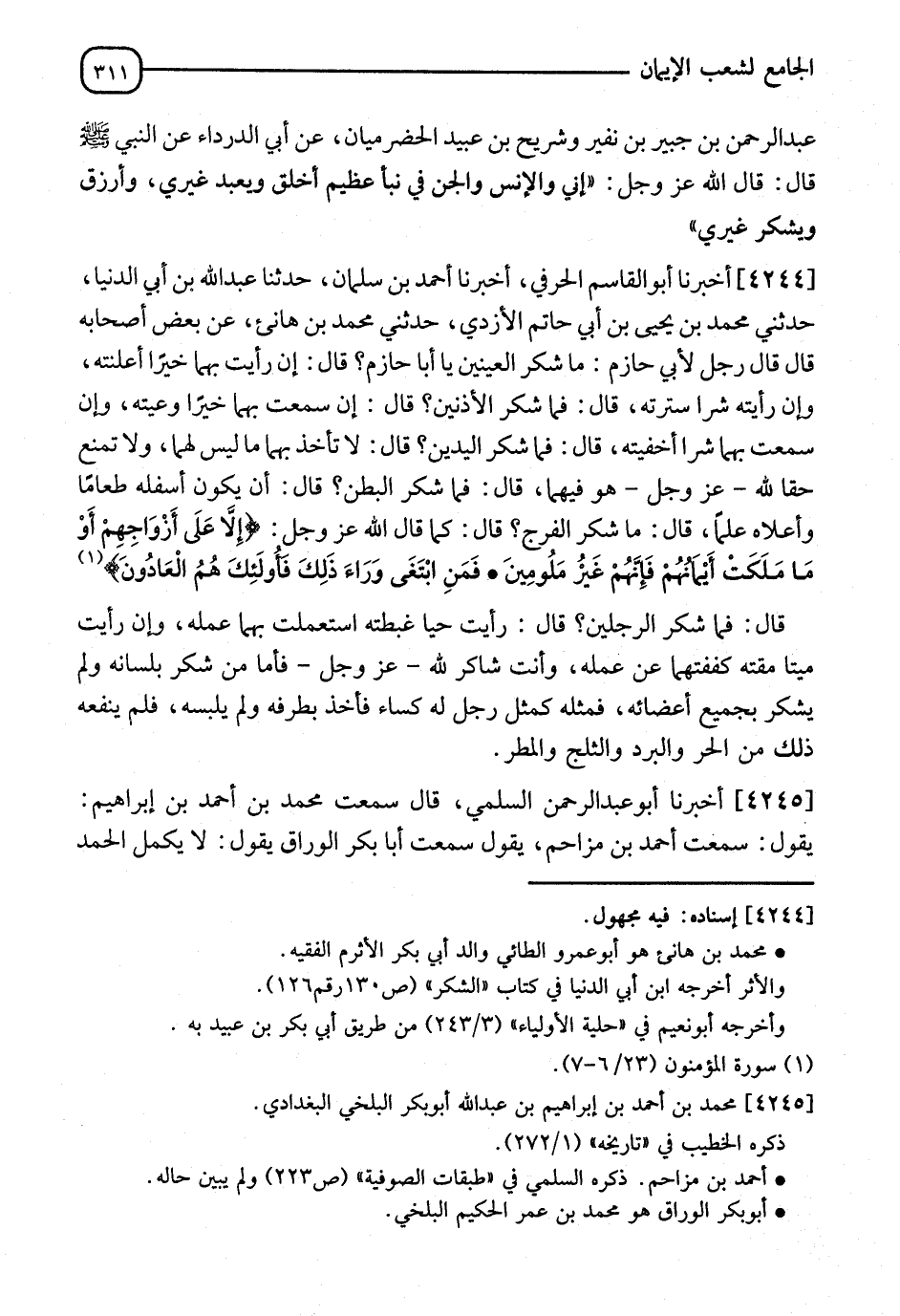 4244 - أَخْبَرَنَا أَبُو الْقَاسِمِ الْحَرفِيُّ، أَخْبَرَنَا أَحْمَدُ بْنُ سَلْمَانَ، حَدَّثَنَا عَبْدُ اللهِ بْنُ أَبِي الدُّنْيَا، حَدَّثَنِي مُحَمَّدُ بْنُ يَحْيَى بْنِ أَبِي حَاتِمٍ الْأَزْدِيِّ، حَدَّثَنِي مُحَمَّدُ بْنُ هَانِئٍ، عَنْ بَعْضِ أَصْحَابِهِ، قَالَ: قَالَ رَجُلٌ لِأَبِي حَازِمٍ: §مَا شُكْرُ الْعَيْنَيْنِ يَا أَبَا حَازِمٍ؟ قَالَ: " إِنْ رَأَيْتَ بِهِمَا خَيْرًا أَعْلَنْتَهُ، وَإِنْ رَأَيْتَ بِهِمَا شَرًّا سَتَرْتَهُ ". قَالَ: فَمَا شُكْرُ الْأُذُنَيْنِ؟ قَالَ: " إِنْ سَمِعْتَ بِهِمَا خَيْرًا وَعَيْتَهُ، وَإِنْ سَمِعْتَ بِهِمَا شَرًّا أَخْفَيْتَهُ ". قَالَ: فَمَا شُكْرُ الْيَدَيْنِ؟ قَالَ: " لَا تَأْخُذْ بِهِمَا مَا لَيْسَ لَهُمَا، وَلَا تَمْنَعْ حَقًّا لِلَّهِ عَزَّ وَجَلَّ هُوَ فِيهِمَا ". قَالَ: فمَا شُكْرُ الْبَطْنِ؟ قَالَ: " أَنْ يَكُونَ أَسْفَلَهُ طَعَامًا، وَأَعْلَاهُ عِلْمًا ". قَالَ: مَا شُكْرُ الْفَرْجِ؟ قَالَ: " كَمَا قَالَ اللهُ عَزَّ وَجَلَّ: {إِلَّا عَلَى أَزْوَاجِهِمْ أَوْ مَا مَلَكَتْ أَيْمَانُهُمْ فَإِنَّهُمْ غَيْرُ مَلُومِينَ فَمَنِ ابْتَغَى وَرَاءَ ذَلِكَ فَأُولَئِكَ هُمُ الْعَادُونَ} [المؤمنون: 7] ". قَالَ: فَمَا شُكْرُ الرِّجْلَيْنِ؟ قَالَ: " إِنْ رَأَيْتَ حَيًّا غَبَطْتَهُ اسْتَعْمَلْتَ بِهِمَا عَمَلَهُ، وَإِنْ رَأَيْتَ مَيِّتًا مَقَتَّهُ كَفَفْتَهُمَا عَنْ عَمَلِهِ، وَأَنْتَ شَاكِرٌ لِلَّهِ عَزَّ وَجَلَّ، فَأَمَّا مَنْ شَكَرَ بِلِسَانِهِ وَلَمْ يَشْكُرْ بِجَمِيعِ أَعْضَائِهِ فَمَثَلُهُ كَمَثَلِ رَجُلٍ لَهُ كِسَاءٌ فَأَخَذَ بِطَرَفِهِ وَلَمْ يَلْبَسْهُ، فَلَمْ يَنْفَعْهُ ذلكَ مِنَ الْحَرِّ وَالْبَرْدِ وَالثَّلْجِ وَالْمَطَرِ "