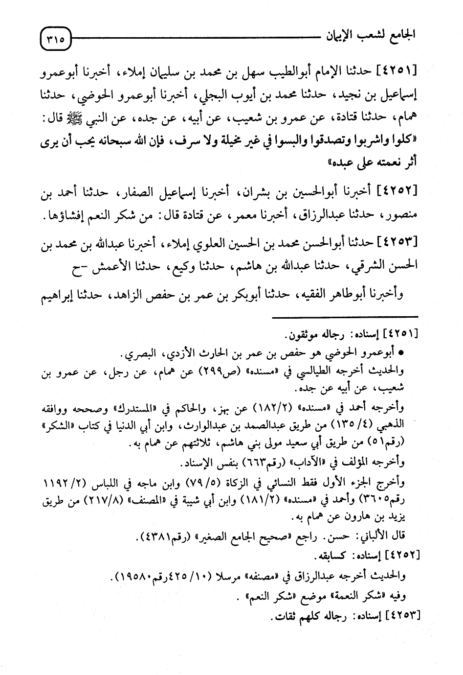 4251 - حَدَّثَنَا الْإِمَامُ أَبُو الطَّيِّبِ سَهْلُ بْنُ مُحَمَّدِ بْنِ سُلَيْمَانَ إِمْلَاءً، أَخْبَرَنَا أَبُو عَمْرٍو إِسْمَاعِيلُ بْنُ نُجَيْدٍ، حَدَّثَنَا مُحَمَّدُ بْنُ أَيُّوبَ الْبَجَلِيُّ، أَخْبَرَنَا أَبُو عُمَرَ الْحَوْضِيُّ، حَدَّثَنَا هَمَّامٌ، حَدَّثَنَا قَتَادَةُ، عَنْ عَمْرِو بْنِ شُعَيْبٍ، عَنْ أَبِيهِ، عَنْ جَدِّهِ، عَنِ النَّبِيِّ صَلَّى اللَّهُ عَلَيْهِ وَسَلَّمَ قَالَ: §" كُلُوا وَاشْرَبُوا وَتَصَدَّقُوا وَالْبَسُوا فِي غَيْرِ مَخِيلَةٍ، وَلَا سَرَفٍ فَإِنَّ اللهَ سُبْحَانَهُ يُحِبُّ أَنْ يَرَى أَثَرَ نِعْمَتِهِ عَلَى عَبْدِهِ "