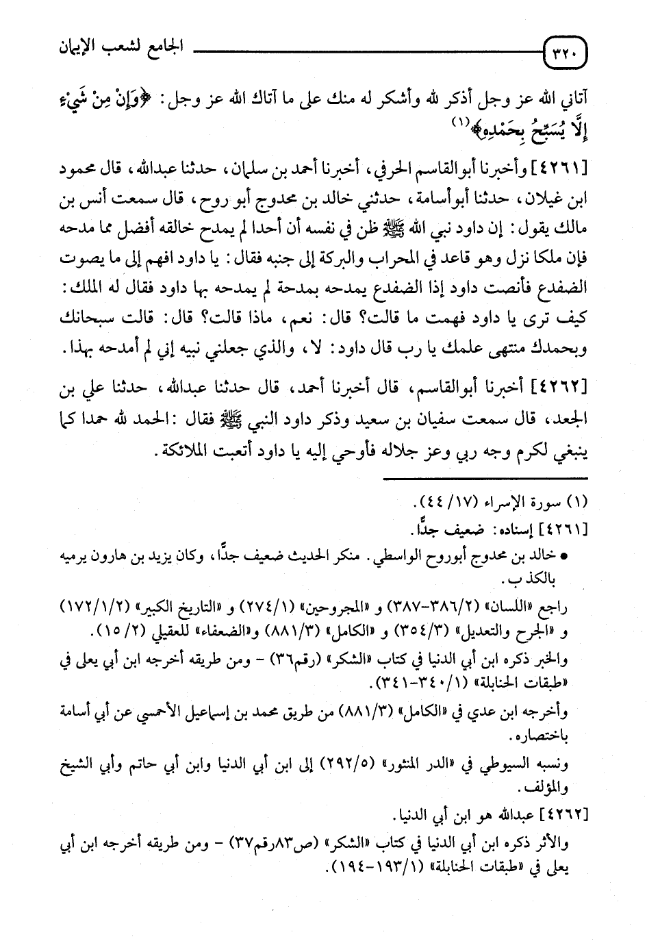 4261 - وَأَخْبَرَنَا أَبُو الْقَاسِمِ الحرفي، أَخْبَرَنَا أَحْمَدُ بْنُ سَلْمَانَ، حَدَّثَنَا عَبْدُ اللهِ، قَالَ مَحْمُودُ بْنُ غَيْلَانَ: حَدَّثَنَا أَبُو أُسَامَةَ، حَدَّثَنِي خَالِدُ بْنُ محدوجٍ أَبُو رَوْحٍ، قَالَ: سَمِعْتُ أَنَسَ بْنَ مَالِكٍ، يَقُولُ: " إِنَّ §دَاوُدَ نَبِيَّ اللهِ صَلَّى اللَّهُ عَلَيْهِ وَسَلَّمَ ظَنَّ فِي نَفْسِهِ أَنَّ أَحَدًا لَمْ يَمْدَحْ خَالِقَهُ أَفْضَلَ مِمَّا مَدَحَهُ، فَإِنَّ مَلَكًا نَزَلَ وَهُوَ قَاعِدٌ فِي الْمِحْرَابِ وَالْبَرَكَةُ إِلَى جَنْبِهِ، فَقَالَ: يَا دَاوُدُ افْهَمْ إِلَى مَا يُصَوِّتُ الضِّفْدَعُ، فَأَنْصَتَ دَاوُدُ إِذَا الضِّفْدَعُ يَمْدَحُهُ بِمَدْحَةٍ لَمْ يَمْدَحْهُ بِهَا دَاوُدُ. فَقَالَ لَهُ الْمَلَكُ: كَيْفَ تَرَى يَا دَاوُدُ؟ فَهِمْتَ مَا قَالَتْ؟ قَالَ: نَعَمْ. قَالَ: مَاذَا قَالَتْ؟ قَالَ: قَالَتْ: سُبْحَانَكَ وَبِحَمْدِكَ مُنْتَهَى عِلْمِكَ يَا رَبِّ. قَالَ دَاوُدُ: لَا، وَالَّذِي جَعَلَنِي نَبِيَّهُ إِنِّي لَمْ أَمْدَحْهُ بِهَذَا "
