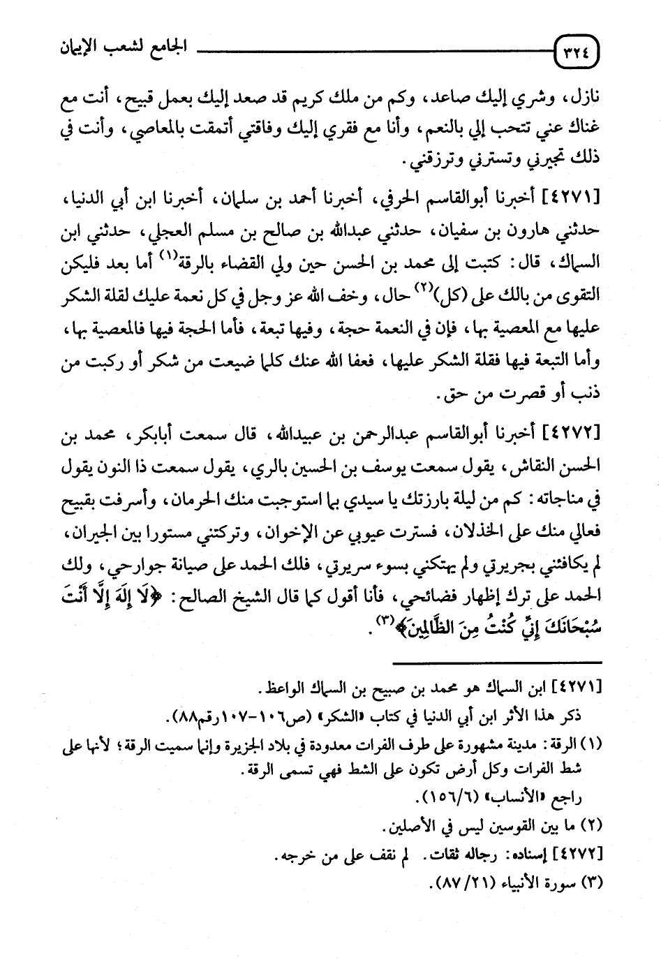 4272 - أَخْبَرَنَا أَبُو الْقَاسِمِ عَبْدُ الرَّحْمَنِ بْنُ عُبَيْدِ اللهِ، قَالَ: سَمِعْتُ أَبَا بَكْرٍ مُحَمَّدَ بْنَ الْحَسَنِ النَّقَّاشَ، يَقُولُ: سَمِعْتُ يُوسُفَ بْنَ الْحُسَيْنِ، بِالرِّيِّ، يَقُولُ: سَمِعْتُ ذَا النُّونِ، يَقُولُ فِي مُنَاجَاتِهِ: §" كَمْ مِنْ لَيْلَةٍ بَارَزْتُكَ يَا سَيِّدِي بِمَا اسْتَوْجَبْتُ مِنْكَ الْحَرَمَانَ، وَأَسْرَفْتُ بِقَبِيحِ فِعَالِي مِنْكَ عَلَى الْخُذْلَانِ، فَسَتَرْتَ عُيُوبِي عَنِ الْإِخْوَانِ، وَتَرَكْتَنِي مَسْتُورًا بَيْنَ الْجِيرَانِ، لَمْ تَكْأَفُنِي بِجَرِيرَتِي، وَلَمْ تُهَتِّكْني بِسُوءِ سَرِيرَتِي، فَلَكَ الْحَمْدُ عَلَى صِيَانَةِ جَوَارِحِي، وَلَكَ الْحَمْدُ عَلَى تَرْكِ إِظْهَارِ فَضَائِحِي، فَأَنَا أَقُولُ كَمَا قَالَ الشَّيْخُ الصَّالِحُ: لَا إِلَهَ إِلَّا أَنْتَ سُبْحَانَكَ إِنِّي كُنْتُ مِنَ الظَّالِمِينَ "