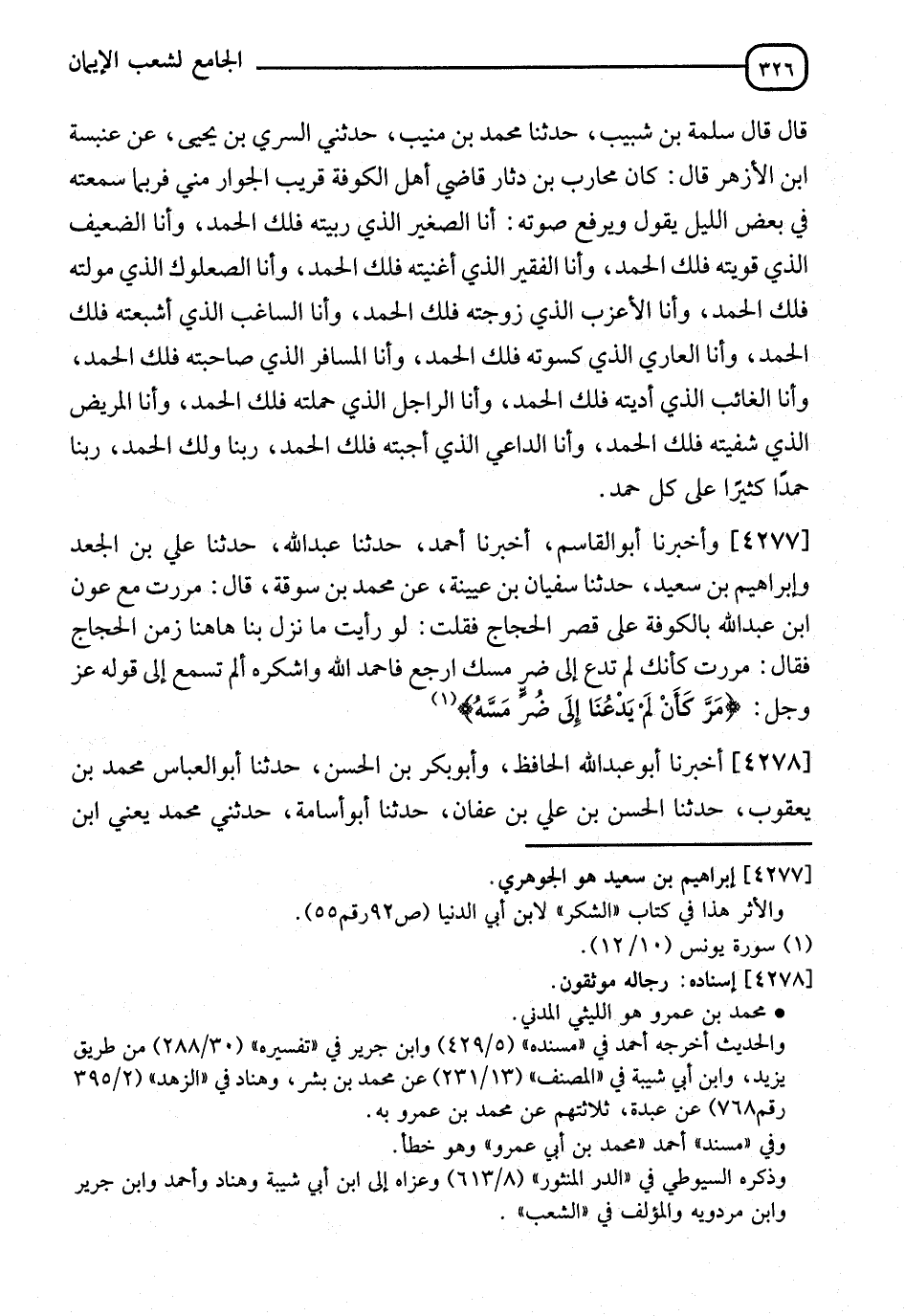 4277 - وَأَخْبَرَنَا أَبُو الْقَاسِمِ، أَخْبَرَنَا أَحْمَدُ، حَدَّثَنَا عَبْدُ اللهِ، حَدَّثَنَا عَلِيُّ بْنُ الْجَعْدِ، وَإِبْرَاهِيمُ بْنُ سَعِيدٍ، حَدَّثَنَا سُفْيَانُ بْنُ عُيَيْنَةَ، عَنْ مُحَمَّدِ بْنِ سُوقَةَ، قَالَ: مَرَرْتُ مَعَ عَوْنِ بْنِ عَبْدِ اللهِ، بِالْكُوفَةِ عَلَى قَصْرِ الْحَجَّاجِ، فَقُلْتُ: لَوْ رَأَيْتَ مَا نَزَلَ بِنَا هَهُنَا زَمَنَ الْحَجَّاجِ، فَقَالَ: " §مَرَرْتَ كَأَنَّكَ لَمْ تَدْعُ إِلَى ضُرٍّ مَسَّكَ، ارْجِعْ فَاحْمَدِ اللهَ وَاشْكُرْهُ، أَلَمْ تَسْمَعْ إِلَى قَوْلِهِ عَزَّ وَجَلَّ {مَرَّ كَأَنْ لَمْ يَدْعُنَا إِلَى ضُرٍّ مَسَّهُ} [يونس: 12] "