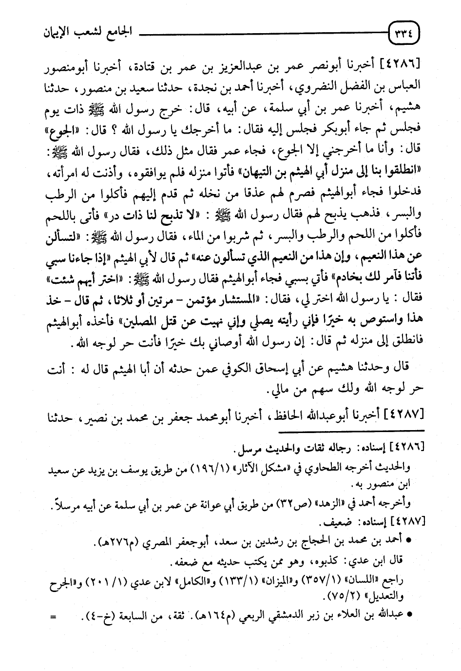 4286 - أَخْبَرَنَا أَبُو نَصْرٍ عُمَرُ بْنُ عَبْدِ الْعَزِيزِ بْنِ عُمَرَ بْنِ قَتَادَةَ، أَخْبَرَنَا أَبُو مَنْصُورٍ الْعَبَّاسُ بْنُ الْفَضْلِ النضْرَوِيُّ، أَخْبَرَنَا أَحْمَدُ بْنُ نَجْدَةَ، حَدَّثَنَا سَعِيدُ بْنُ مَنْصُورٍ، حَدَّثَنَا هُشَيْمٌ، أَخْبَرَنَا عُمَرُ بْنُ أَبِي سَلَمَةَ، عَنْ أَبِيهِ، قَالَ: خَرَجَ رَسُولُ اللهِ صَلَّى اللَّهُ عَلَيْهِ وَسَلَّمَ ذَاتَ يَوْمٍ فَجَلَسَ، ثُمَّ جَاءَ أَبُو بَكْرٍ فَجَلَسَ إِلَيْهِ فَقَالَ: مَا أَخْرَجَكَ يَا رَسُولَ اللهِ؟ قَالَ: " الْجُوعُ ". قَالَ: وَأَنَا مَا أَخْرَجَنِي إِلَّا الْجُوعُ، فَجَاءَ عُمَرُ، فَقَالَ مِثْلَ ذَلِكَ، فَقَالَ رَسُولُ اللهِ صَلَّى اللَّهُ عَلَيْهِ وَسَلَّمَ: " انْطَلِقُوا بِنَا إِلَى مَنْزِلِ أَبِي الْهَيْثَمِ بْنِ التَّيِّهَانِ " فَأَتَوْا مَنْزِلَهُ فَلَمْ يُوَافِقُوهُ، وَأَذِنَتْ لَهُ امْرَأَتُهُ فَدَخَلُوا فَجَاءَ أَبُو الْهَيْثَمِ فَصَرَمَ لَهُمْ عَذْقًا مِنْ نَخْلَةٍ، ثُمَّ قَدَّمَ إِلَيْهِمْ فَأَكَلُوا مِنَ الرُّطَبِ وَالْبُسْرِ، فَذَهَبَ يَذْبَحُ لَهُمْ، فَقَالَ رَسُولُ اللهِ صَلَّى اللَّهُ عَلَيْهِ وَسَلَّمَ: " لَا تَذْبَحْ لَنَا ذَاتَ دَرٍّ " فَأَتَى بِاللَّحْمِ فَأَكَلُوا مِنَ اللَّحْمِ وَالرُّطَبِ وَالْبُسْرِ، ثُمَّ شَرِبُوا مِنَ الْمَاءِ، فَقَالَ رَسُولُ اللهِ صَلَّى اللَّهُ عَلَيْهِ وَسَلَّمَ: " §لَتُسْأَلُنَّ عَنْ هَذَا النَّعِيمِ، وَإِنَّ هَذَا مِنَ النَّعِيمِ الَّذِي تُسْأَلُونَ عَنْهُ " ثُمَّ قَالَ لِأَبِي الْهَيْثَمِ: " إِذَا جَاءَنَا سَبْيٌ فَأْتِنَا فَآمُرُ لَكَ بِخَادِمٍ "، فَأُتِيَ بِسَبْيٍ فَجَاءَ أَبُو الْهَيْثَمِ، فَقَالَ رَسُولُ اللهِ صَلَّى اللَّهُ عَلَيْهِ وَسَلَّمَ: " اخْتَرْ أَيَّهُمْ شِئْتَ " فَقَالَ: يَا رَسُولَ اللهِ اخْتَرْ لِي. فَقَالَ: " الْمُسْتَشَارُ مُؤْتَمَنٌ " مَرَّتَيْنِ - أَوْ ثَلَاثًا -، ثُمَّ قَالَ: " خُذْ هَذَا، وَاسْتَوْصِ بِهِ خَيْرًا، فَإِنِّي رَأَيْتُهُ يُصَلَّى، وَإِنِّي نُهِيتُ عَنْ قَتْلِ الْمُصَلِّينَ، فَأَخَذَهُ أَبُو الْهَيْثَمِ فَانْطَلَقَ إِلَى مَنْزِلِهِ، ثُمَّ قَالَ: إِنَّ رَسُولَ اللهِ أَوْصَانِي بِكَ خَيْرًا فَأَنْتَ حُرٌّ لِوَجْهِ اللهِ. قَالَ: وحدثنا هشيم، عَنْ أَبِي إِسْحَاقَ الْكُوفِيِّ، عَمَّنْ حَدَّثَهُ، أَنَّ أَبَا الْهَيْثَمِ قَالَ لَهُ: أَنْتَ حَرٌّ لِوَجْهِ اللهِ وَلَكَ سَهْمٌ مِنْ مَالِي