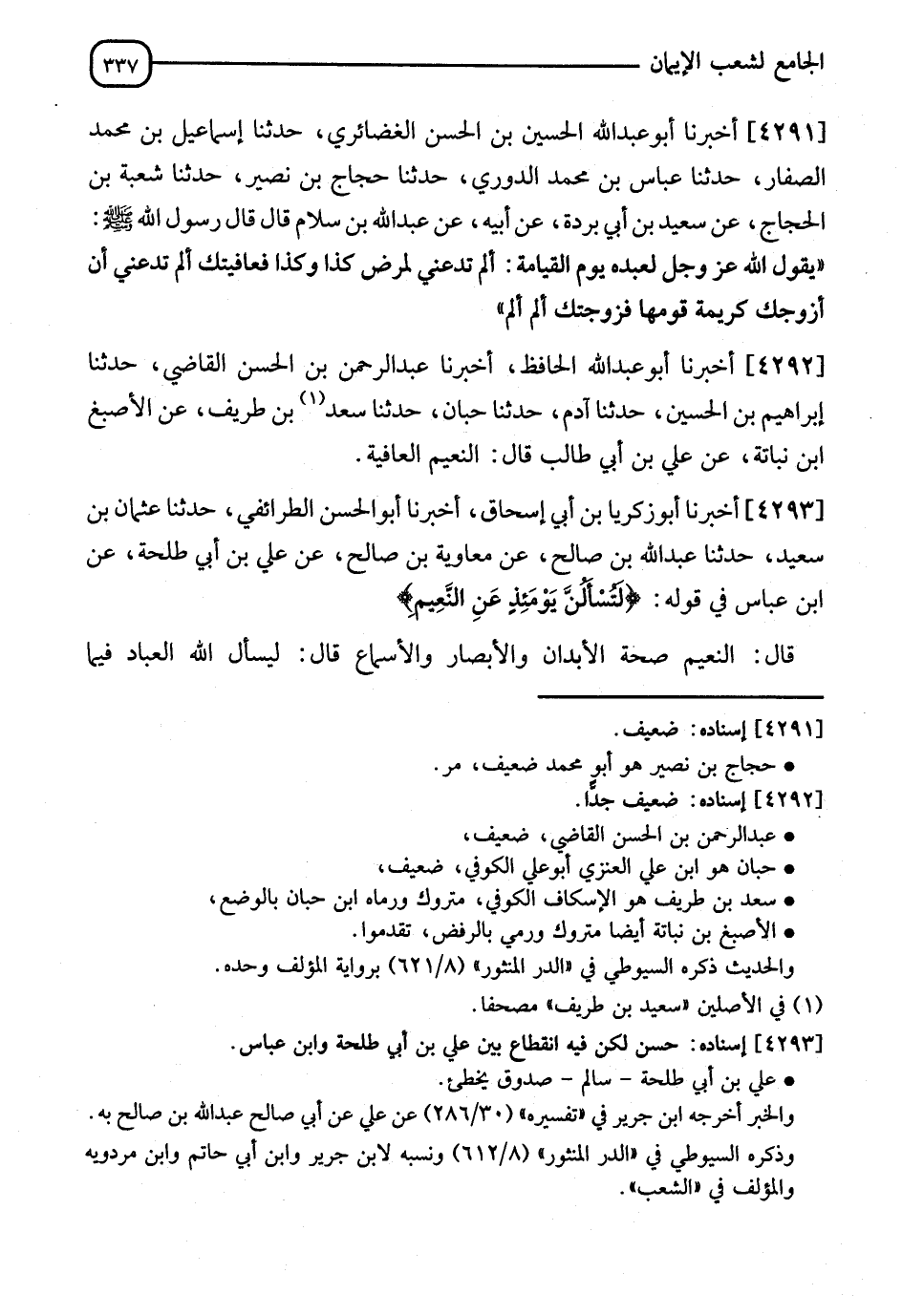 4293 - أَخْبَرَنَا أَبُو زَكَرِيَّا بْنُ أَبِي إِسْحَاقَ، أَخْبَرَنَا أَبُو الْحَسَنِ الطَّرَائِفِيُّ، حَدَّثَنَا عُثْمَانُ بْنُ سَعِيدٍ، حَدَّثَنَا عَبْدُ اللهِ بْنُ صَالِحٍ، عَنْ مُعَاوِيَةَ بْنِ صَالِحٍ، عَنْ عَلِيِّ بْنِ أَبِي طَلْحَةَ، عَنِ ابْنِ عَبَّاسٍ، فِي قَوْلِهِ: {لَتُسْأَلُنَّ يَوْمَئِذٍ عَنِ النَّعِيمِ} [التكاثر: 8]، قَالَ: " النَّعِيمُ: صِحَّةُ الْأَبْدَانِ وَالْأَبْصَارِ وَالْأَسْمَاعِ "، قَالَ: " §ليَسْأَلُ اللهُ الْعِبَادَ فِيمَا -[338]- اسْتَعْمَلُوهَا، وَهُوَ أَعْلَمُ بِذَلِكَ مِنْهُمْ وَهُوَ قَوْلُهُ: {إِنَّ السَّمْعَ وَالْبَصَرَ وَالْفُؤَادَ كُلُّ أُولَئِكَ كَانَ عَنْهُ مَسْئُولًا} "