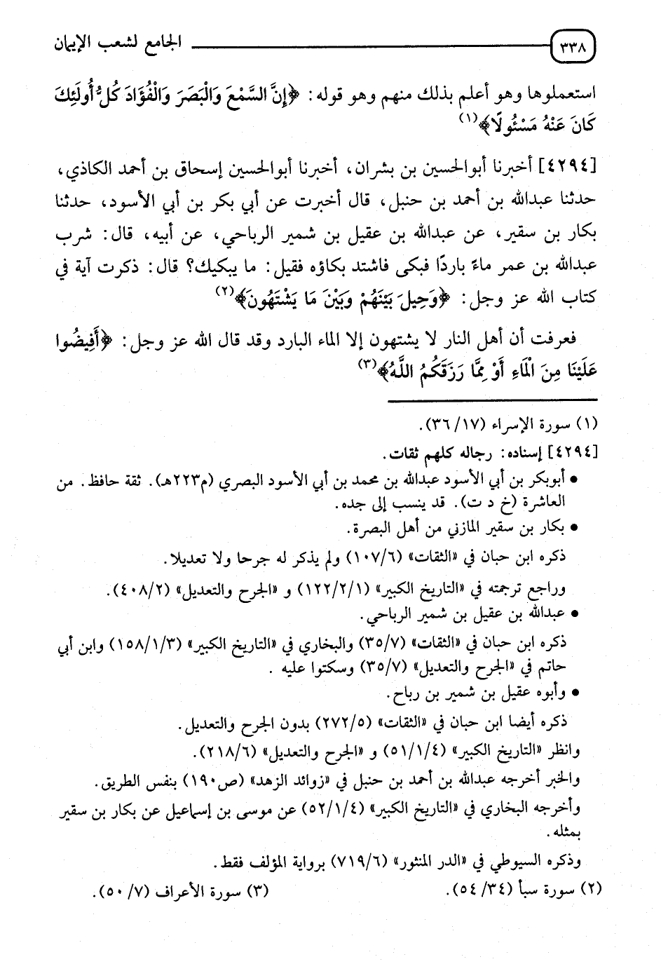 4294 - أَخْبَرَنَا أَبُو الْحُسَيْنِ بْنُ بِشْرَانَ، أَخْبَرَنَا أَبُو الْحُسَيْنِ إِسْحَاقُ بْنُ أَحْمَدَ الْكَاذِيُّ، حَدَّثَنَا عَبْدُ اللهِ بْنُ أَحْمَدَ بْنِ حَنْبَلٍ، قَالَ: أُخْبِرْتُ عَنْ أَبِي بَكْرِ بْنِ أَبِي الْأَسْوَدِ، حَدَّثَنَا بَكَّارُ بْنُ سُقَيْرٍ، عَنْ عَبْدِ اللهِ بْنِ عَقِيلِ بْنِ شُمَيْرٍ الرِّبَاحِيِّ، عَنْ أَبِيهِ، قَالَ: شَرِبَ عَبْدُ اللهِ بْنُ عُمَرَ مَاءً بَارِدًا فَبَكَى فَاشْتَدَّ بُكَاؤُهُ، فَقِيلَ: مَا يُبْكِيكَ؟ قَالَ: " ذَكَرْتُ آيَةً فِي كِتَابِ اللهِ عَزَّ وَجَلَّ: {وَحِيلَ بَيْنَهُمْ وَبَيْنَ مَا يَشْتَهُونَ} [سبأ: 54] فَعَرَفْتُ أَنَّ §أَهْلَ النَّارِ لَا يَشْتَهُونَ إِلَّا الْمَاءَ الْبَارِدَ، وَقَدْ قَالَ اللهُ عَزَّ وَجَلَّ: {أَفِيضُوا عَلَيْنَا مِنَ الْمَاءِ أَوْ مِمَّا رَزَقَكُمُ اللهُ} [الأعراف: 50] "