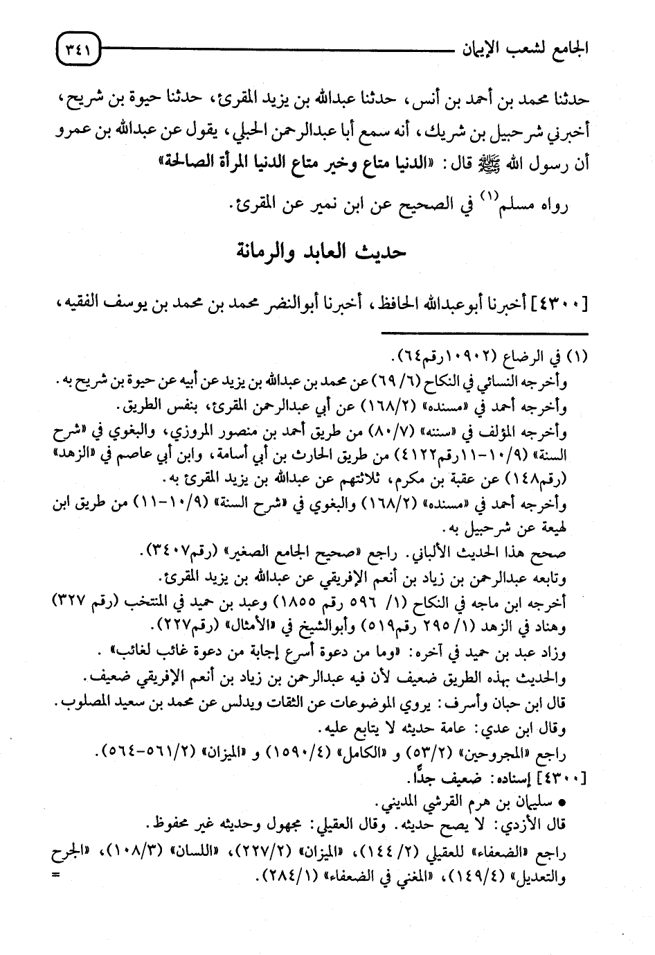 4300 - أَخْبَرَنَا أَبُو عَبْدِ اللهِ الْحَافِظُ، أَخْبَرَنَا أَبُو النَّضْرِ مُحَمَّدُ بْنُ مُحَمَّدِ بْنِ يُوسُفَ الْفَقِيهُ، -[342]- حَدَّثَنَا عُثْمَانُ بْنُ سَعِيدٍ الدَّارِمِيُّ، حَدَّثَنَا عَبْدُ اللهِ بْنُ صَالِحٍ الْمِصْرِيُّ، حَدَّثَنِي سُلَيْمَانُ بْنُ هَرِمٍ الْقُرَشِيُّ، عَنْ مُحَمَّدِ بْنِ الْمُنْكَدِرِ، عَنْ جَابِرِ بْنِ عَبْدِ اللهِ، قَالَ: خَرَجَ إِلَيْنَا رَسُولِ اللهِ صَلَّى اللَّهُ عَلَيْهِ وَسَلَّمَ فَقَالَ: " خَرَجَ مِنْ عِنْدِي خَلِيلِي آنِفًا جِبْرِيلُ عَلَيْهِ السَّلَامُ، فَقَالَ: يَا مُحَمَّدُ، وَالَّذِي بَعَثَنِي بِالْحَقِّ، إِنَّ لِلَّهِ لعَبْدًا مِنْ عِبَادِهِ عَبْدَ اللهَ خَمْسَمِائَةِ سَنَةٍ عَلَى رَأْسِ جَبَلٍ فِي الْبَحْرِ عَرْضُهُ وَطُولُهُ ثَلَاثُونَ ذِرَاعًا فِي ثَلَاثِينَ ذِرَاعًا مُحِيطٌ بِهِ أَرْبَعَةُ آلَافِ فَرْسَخٍ مِنْ كُلِّ نَاحِيَةٍ، وَأَخْرَجَ اللهُ لَهُ عَيْنَا عَذْبًا بِعَرْضِ الْأُصْبَعِ تَبُضُّ بِمَاءٍ عَذْبٍ فَيُسْتَنْقَعُ فِي أَصْلِ الْجَبَلِ، وَشَجَرَةَ رُمَّانٍ تُخْرِجُ كُلَّ لَيْلَةٍ رُمَّانَةً فَتُغَذِّيَهُ فَإِذَا أَمْسَى نَزَلَ فَأَصَابَ مِنَ الْوَضُوءِ وَأَخَذَ تِلْكَ الرُّمَّانَةَ فَأَكَلَهَا، ثُمَّ قَامَ إِلَى صَلَاتِهِ فَتَمَنَّى مِنْ رَبِّهِ عِنْدَ وَقْتِ الْأَجَلِ أَنْ يَقْبِضَهُ سَاجِدًا وَأَنْ لَا يَجْعَلَ لِلْأَرْضِ وَلَا لِشَيْءٍ يُفْسِدُهُ عَلَيْهِ سَبِيلًا حَتَّى يَبْعَثَهُ وَهُوَ سَاجِدٌ فَفَعَلَ فَنَحْنُ نَمُرُّ عَلَيْهِ إِذَا هَبَطْنَا وَإِذَا عَرَجْنَا فَنَجِدُهُ فِي الْعِلْمِ يُبْعَثُ يَوْمَ الْقِيَامَةِ فَيُوقَفُ بَيْنَ يَدَيِ اللهِ عَزَّ وَجَلَّ فَيَقُولُ لَهُ الرَّبُّ: §أَدْخِلُوا عَبْدِيَ الْجَنَّةَ بِرَحْمَتِي. فَيَقُولُ: رَبِّ بِعَمَلِي، فَيَقُولُ: أَدْخِلُوا عَبْدِيَ الْجَنَّةَ بِرَحْمَتِي، فَيَقُولُ: بَلْ بِعَمَلِي. فَيَقُولُ اللهُ لِمَلَائِكَتِهِ: قَايِسُوا بِنِعْمَتِي عَلَيْهِ وَبِعَمَلِهِ، فَيُوجَدُ نِعْمَةُ الْبَصَرِ قَدْ أَحَاطَتْ بِعِبَادَتِهِ خَمْسِمِائَةِ سَنَةٍ، وَبَقِيَتْ نِعْمَةُ الْجَسَدِ فَضْلًا عَلَيْهِ، فَيَقُولُ: أَدْخِلُوا عَبْدِيَ النَّارَ، قَالَ: فَيُجَرُّ إِلَى النَّارِ فَيُنَادِي رَبِّ بِرَحْمَتِكُمْ أَدْخِلْنِي الْجَنَّةَ، فَيَقُولُ: رُدُّوهُ فَيُوقَفُ بَيْنَ يَدَيِ اللهِ تَعَالَى فَيَقُولُ: يَا عَبْدي مَنْ خَلَقَكَ وَلَمْ تَكُ شَيْئًا؟ فَيَقُولُ: أَنْتَ يَا رَبِّ، فَيَقُولُ له: أَكَانَ ذَلِكَ مِنْ قِبَلِكَ أَمْ بِرَحْمَتِي؟ فَيَقُولُ: بَلْ بِرَحْمَتِكَ، فَيَقُولُ: مَنْ قَوَّاكَ لِعُبَادَةِ خَمْسِمِائَةِ سَنَةٍ؟ -[343]- فَيَقُولُ: أَنْتَ، فَيَقُولُ: مَنْ أَنْزَلَكَ فِي جَبَلٍ وَسَطَ اللُّجَّةِ وَأَخْرَجَ لَكَ الْمَاءَ الْعَذْبَ مِنَ الْمَاءِ الْمَالِحِ، وَأَخْرَجَ لَكَ كُلَّ لَيْلَةٍ رُمَّانَةً، وَإِنَّمَا تَخْرُجُ فِي السَّنَةِ مَرَّةً، وَسَأَلْتَنِي أَنْ أَقْبِضَكَ سَاجِدًا فَفَعَلْتُ ذَلِكَ بِكَ؟ فَيَقُولُ: أَنْتَ يَا رَبِّ. قَالَ: فَذَلِكَ بِرَحْمَتِي فَبِرَحْمَتِي أُدْخِلْتَ الْجَنَّةَ أَدْخِلُوا عَبْدِيَ الْجَنَّةَ بِرَحْمَتِي فَنِعْمَ الْعَبْدُ كُنْتَ يَا عَبْدِي فَأَدْخَلَهُ الْجَنَّةَ، قَالَ جِبْرِيلُ عَلَيْهِ السَّلَامُ: إِنَّمَا الْأَشْيَاءُ بِرَحْمَةِ اللهِ يَا مُحَمَّدُ "