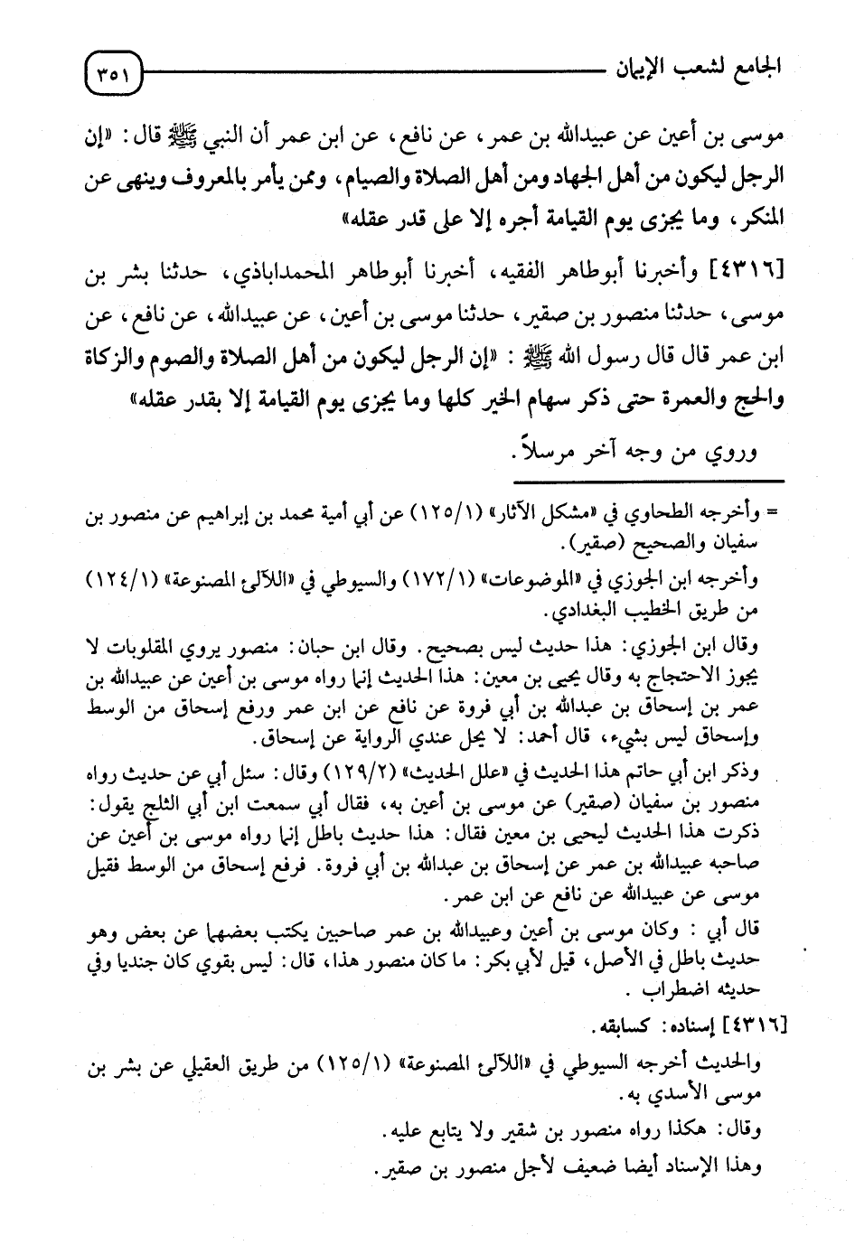 4316 - وَأَخْبَرَنَا أَبُو طَاهِرٍ الْفَقِيهُ، أَخْبَرَنَا أَبُو طَاهِرٍ الْمُحَمَّدُآبَاذِيُّ، حَدَّثَنَا بِشْرُ بْنُ مُوسَى، حَدَّثَنَا مَنْصُورُ بْنُ صُقَيْرٍ، حَدَّثَنَا مُوسَى بْنُ أَعْيَنَ، عَنْ عُبَيْدِ اللهِ، عَنْ نَافِعٍ، عَنِ ابْنِ عُمَرَ، قَالَ: قَالَ رَسُولُ اللهِ صَلَّى اللَّهُ عَلَيْهِ وَسَلَّمَ: " إِنَّ §الرَّجُلَ لِيَكُونُ مِنْ أَهْلِ الصَّلَاةِ وَالصَّوْمِ وَالزَّكَاةِ وَالْحَجِّ وَالْعُمْرَةِ حَتَّى ذَكَرَ سِهَامَ الْخَيْرِ كُلَّهَا، وَمَا يُجْزَى يَوْمَ الْقِيَامَةِ إِلَّا بِقَدْرِ عَقْلِهِ ". " وَرُوِيَ مِنْ وَجْهٍ آخَرَ مُرْسَلًا "