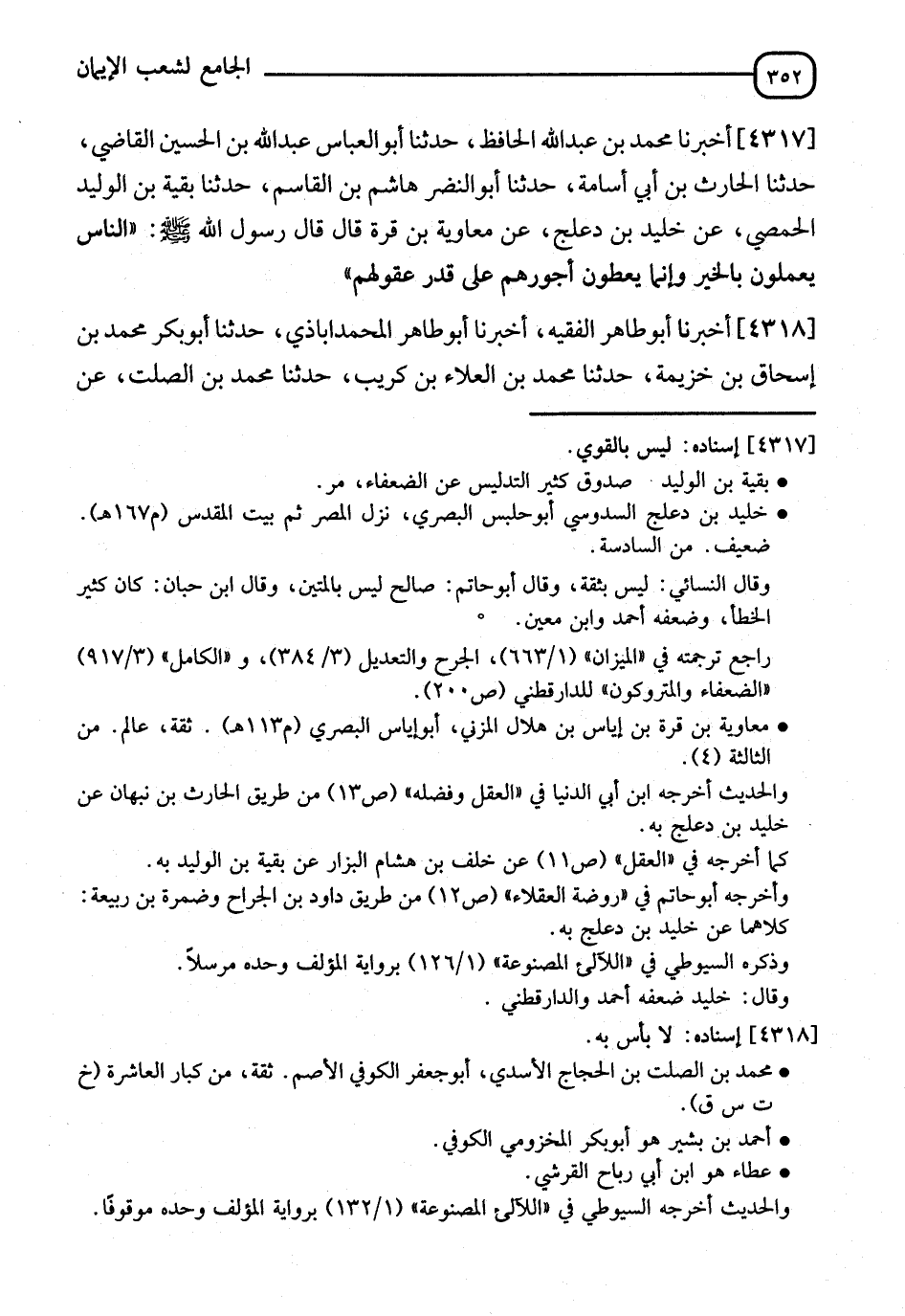 4317 - أَخْبَرَنَا مُحَمَّدُ بْنُ عَبْدِ اللهِ الْحَافِظُ، حَدَّثَنَا أَبُو الْعَبَّاسِ عَبْدُ اللهِ بْنُ الْحُسَيْنِ الْقَاضِي، حَدَّثَنَا الْحَارِثُ بْنُ أَبِي أُسَامَةَ، حَدَّثَنَا أَبُو النَّضْرِ هَاشِمُ بْنُ الْقَاسِمِ، حَدَّثَنَا بَقِيَّةُ بْنُ الْوَلِيدِ الْحِمْصِيُّ، عَنْ خُلَيْدِ بْنِ دَعْلَجٍ، عَنْ مُعَاوِيَةَ بْنِ قُرَّةَ، قَالَ: قَالَ رَسُولُ اللهِ صَلَّى اللَّهُ عَلَيْهِ وَسَلَّمَ: " §النَّاسُ يَعْمَلُونَ بِالْخَيْرِ، وَإِنَّمَا يُعْطَوْنَ أُجُورَهُمْ عَلَى قَدْرِ عُقُولِهِمْ "