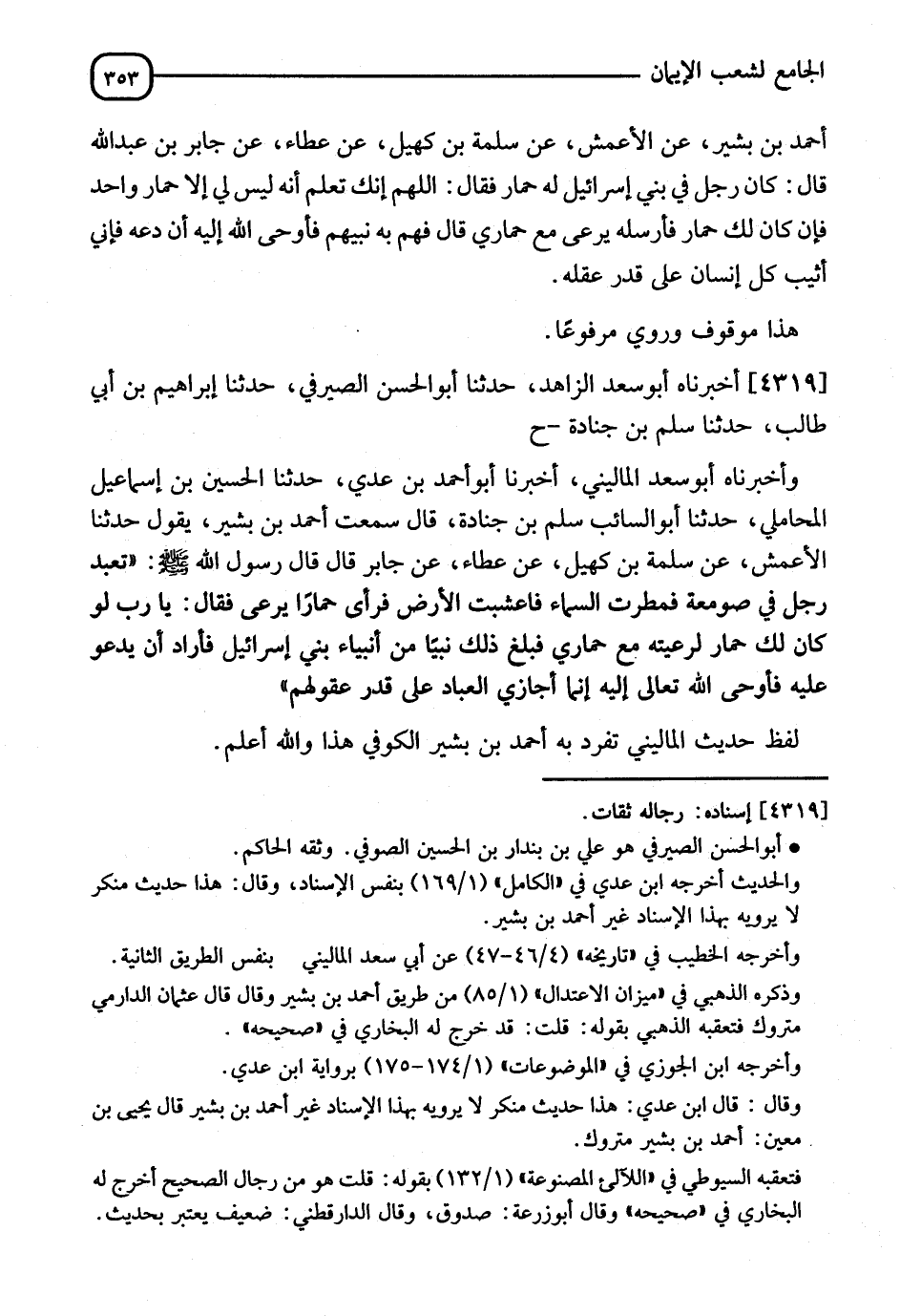 4319 - أَخْبَرَنَاهُ أَبُو سَعْدٍ الزَّاهِدُ، حَدَّثَنَا أَبُو الْحَسَنِ الصَّيْرَفِيُّ، حَدَّثَنَا إِبْرَاهِيمُ بْنُ أَبِي طَالِبٍ، حَدَّثَنَا مُسْلِمُ بْنُ جُنَادَةَ، ح، وَأَخْبَرَنَاهُ أَبُو سَعْدٍ الْمَالِينِيُّ، أَخْبَرَنَا أَبُو أَحْمَدَ بْنُ عَدِيٍّ، حَدَّثَنَا الْحُسَيْنُ بْنُ إِسْمَاعِيلَ الْمُحَامِلِيُّ، حَدَّثَنَا أَبُو السَّائِبِ مُسْلِمُ بْنُ جُنَادَةَ، قَالَ: سَمِعْتُ أَحْمَدَ بْنَ بَشِيرٍ، يَقُولُ: حَدَّثَنَا الْأَعْمَشُ، عَنْ سَلَمَةَ بْنِ كُهَيْلٍ، عَنْ عَطَاءٍ، عَنْ جَابِرٍ، قَالَ: قَالَ رَسُولُ اللهِ صَلَّى اللَّهُ عَلَيْهِ وَسَلَّمَ: " تَعَبَّدَ رَجُلٌ فِي صَوْمَعَةٍ فَمَطَرَتِ السَّمَاءُ فَأَعْشَبْتِ الْأَرْضُ فَرَأَى حِمَارًا يَرْعَى فَقَالَ: يا رَبِّ لَوْ كَانَ لَكَ حِمَارٌ لِرَعِيَّتُهُ مَعَ حِمَارِي فَبَلَغَ ذَلِكَ نَبِيًّا مِنْ أَنْبِيَاءِ بَنِي إِسْرَائِيلَ فَأَرَادَ أَنْ يَدْعُوَ عَلَيْهِ، فَأَوْحَى اللهُ تَعَالَى إِلَيْهِ: §إِنَّمَا أُجَازِي الْعِبَادَ عَلَى قَدْرِ عُقُولِهِمْ ". " لَفْظُ حَدِيثِ الْمَالِينِيِّ، تَفَرَّدَ بِهِ أَحْمَدُ بْنُ بَشِيرٍ الْكُوفِيُّ، هَذَا وَاللهُ أَعْلَمُ "