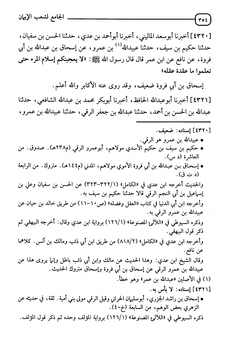 4320 - أَخْبَرَنَا أَبُو سَعْدٍ الْمَالِينِيُّ، أَخْبَرَنَا أَبُو أَحْمَدَ بْنُ عَدِيٍّ، حَدَّثَنَا الْحَسَنُ بْنُ سُفْيَانَ، حَدَّثَنَا حَكِيمُ بْنُ سَيْفٍ، حَدَّثَنَا عُبَيْدُ اللهِ بْنُ عَمْرٍو، عَنْ إِسْحَاقَ بْنِ عَبْدِ اللهِ بْنِ أَبِي فَرْوَةَ، عَنْ نَافِعٍ، عَنِ ابْنِ عُمَرَ، قَالَ: قَالَ رَسُولُ اللهِ صَلَّى اللَّهُ عَلَيْهِ وَسَلَّمَ: §" لَا يُعْجِبَنَّكُمْ إِسْلَامُ الْمَرْءِ حَتَّى تَعْلَمُوا مَا عُقْدَةُ عَقْلِهِ ". " إِسْحَاقُ بْنُ أَبِي فَرْوَةَ ضَعِيفٌ، وَقَدْ رَوَى عَنْهُ الْأَكَابِرُ وَاللهُ أَعْلَمُ "