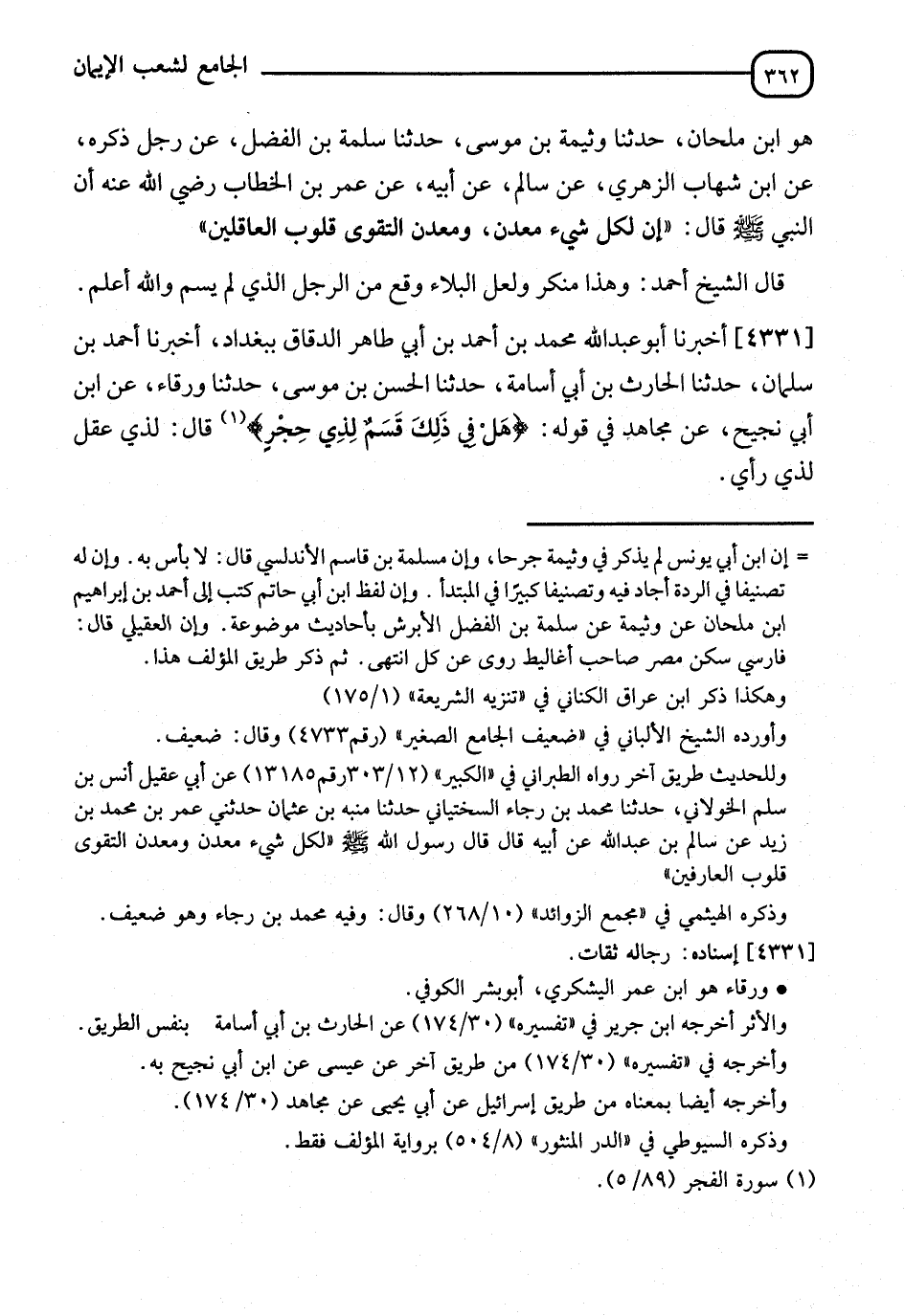 4331 - أَخْبَرَنَا أَبُو عَبْدِ اللهِ مُحَمَّدُ بْنُ أَحْمَدَ بْنِ أَبِي طَاهِرٍ الدَّقَّاقُ، بِبَغْدَادَ، أَخْبَرَنَا أَحْمَدُ بْنُ سَلْمَانَ، حَدَّثَنَا الْحَارِثُ بْنُ أَبِي أُسَامَةَ، حَدَّثَنَا الْحَسَنُ بْنُ مُوسَى، حَدَّثَنَا وَرْقَاءُ، عَنِ ابْنِ أَبِي نَجِيحٍ، عَنْ مُجَاهِدٍ، فِي قَوْلِهِ: {هَلْ فِي ذَلِكَ قَسَمٌ لِذِي حِجْرٍ} [الفجر: 5]. قَالَ: " §لِذِي عَقْلٍ، لِذِي رَأْيٍ "
