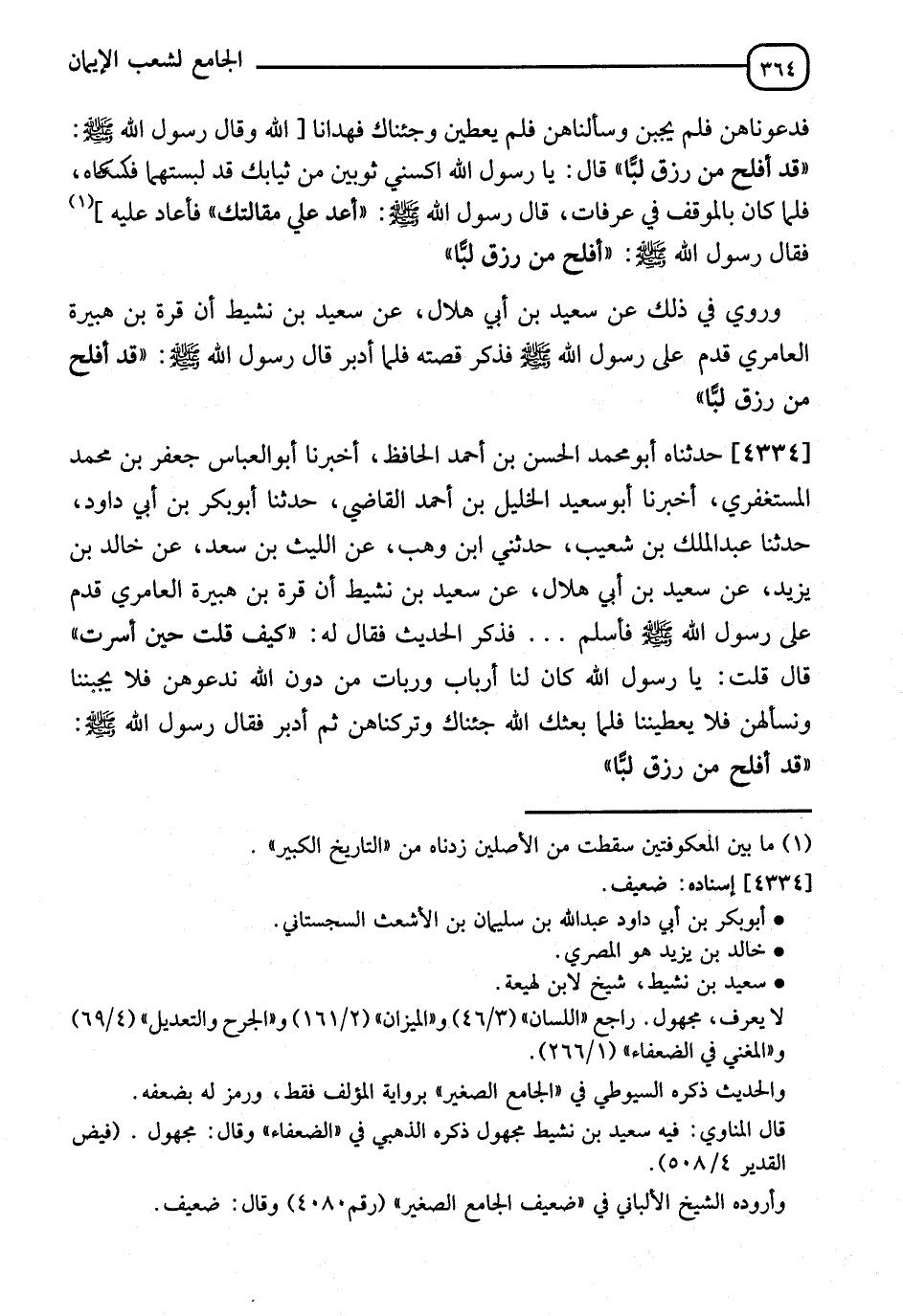 4334 - حدثناه أَبُو مُحَمَّدٍ الْحَسَنُ بْنُ أَحْمَدَ الْحَافِظُ، أَخْبَرَنَا أَبُو الْعَبَّاسِ جَعْفَرُ بْنُ مُحَمَّدٍ الْمُسْتَغْفِرِيُّ، أَخْبَرَنَا أَبُو سَعِيدٍ الْخَلِيلِ بْنِ أَحْمَدَ الْقَاضِي، حَدَّثَنَا أَبُو بَكْرِ بْنُ أَبِي دَاوُدَ، حَدَّثَنَا عَبْدُ الْمَلِكِ بْنُ شُعَيْبٍ، حَدَّثَنِي ابْنُ وَهْبٍ، عَنِ اللَّيْثِ بْنِ سَعْدٍ، عَنْ خَالِدِ بْنِ يَزِيدَ، عَنْ سَعِيدِ بْنِ أَبِي هِلَالٍ، عَنْ سَعِيدِ بْنِ نَشِيطٍ، أَنَّ قُرَّةَ بْنَ هُبَيْرَةَ الْعَامِرِيَّ، قَدِمَ عَلَى رَسُولِ اللهِ صَلَّى اللَّهُ عَلَيْهِ وَسَلَّمَ فَأَسْلَمَ، فَذَكَرَ الْحَدِيثَ، فَقَالَ لَهُ: " كَيْفَ قُلْتَ حِينَ أُسِرْتَ؟ " قَالَ: قُلْتُ: يَا رَسُولَ اللهِ كَانَ لَنَا أَرْبَابٌ وَرَبَّاتٌ مِنْ دُونِ اللهِ نَدْعُوهُنَّ فَلَا يُجِبْنَنَا، وَنَسْأَلُهُنَّ فَلَا يُعْطِينَنَا، فَلَمَّا بَعَثَكَ اللهُ جِئْنَاكَ وَتَرْكَنْاهُنَّ، ثُمَّ أَدْبَرَ، فَقَالَ رَسُولُ اللهِ صَلَّى اللَّهُ عَلَيْهِ وَسَلَّمَ: §" قَدْ أَفْلَحَ مَنْ رُزِقَ لُبًّا "
