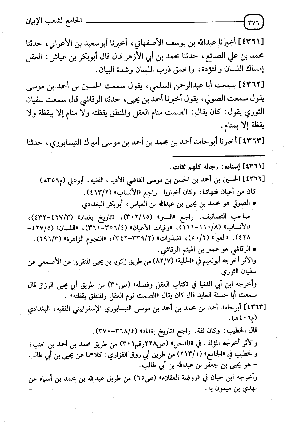 4361 - أَخْبَرَنَا عَبْدُ اللهِ بْنُ يُوسُفَ الْأَصْفَهَانِيُّ، أَخْبَرَنَا أَبُو سَعِيدِ بْنِ الْأَعْرَابِيِّ، حَدَّثَنَا مُحَمَّدُ بْنُ عَلِيٍّ الصَّائِغُ، حَدَّثَنَا مُحَمَّدُ بْنُ أَبِي الْأَزْهَرِ، قَالَ: قَالَ أَبُو بَكْرِ بْنِ عَيَّاشٍ: " §الْعَقْلُ: إِمْسَاكُ اللِّسَانِ، وَالتُّؤَدَةُ. وَالْحُمْقُ: ذَرَبُ اللِّسَانِ، وَشِدَّةُ الْبَيَانِ "