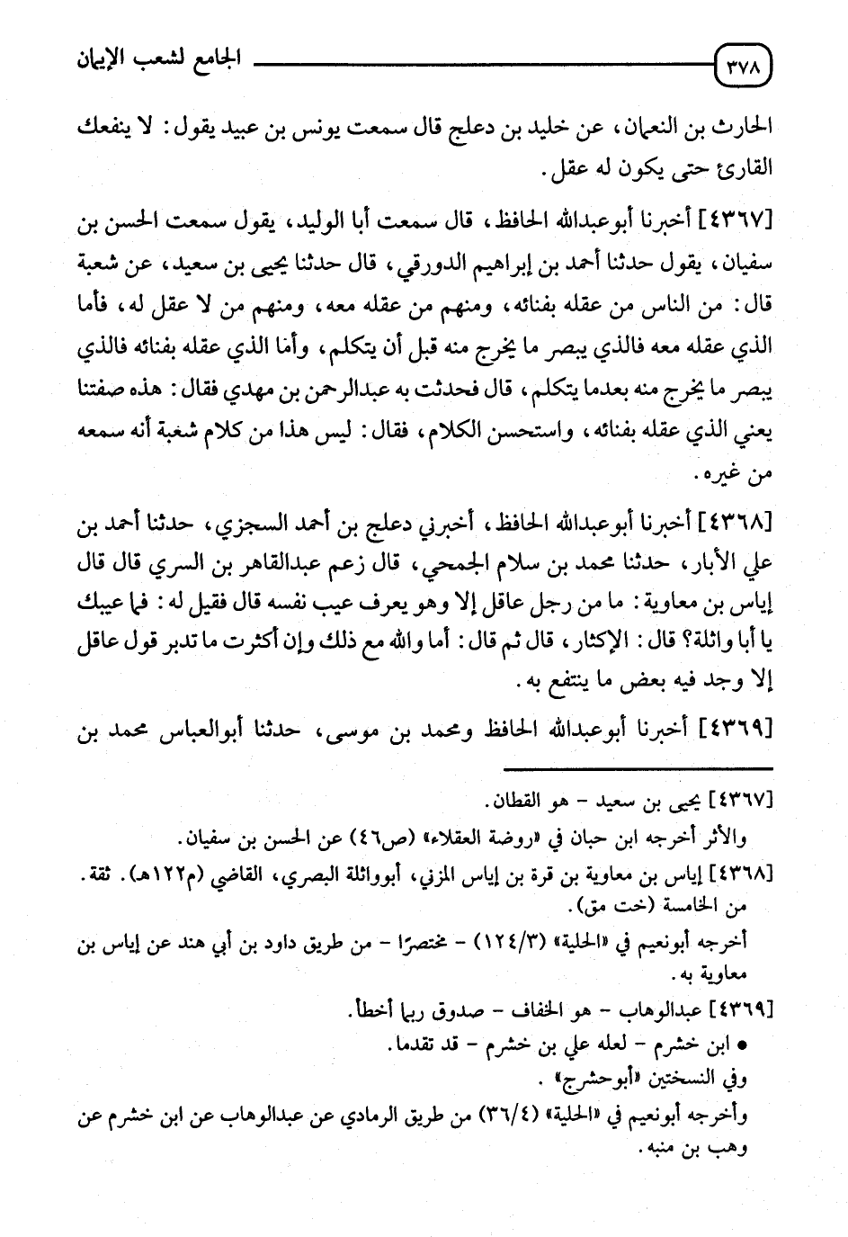 4367 - أَخْبَرَنَا أَبُو عَبْدِ اللهِ الْحَافِظُ، قَالَ: سَمِعْتُ أَبَا الْوَلِيدِ، يَقُولُ: سَمِعْتُ الْحَسَنَ بْنَ سُفْيَانَ، يَقُولُ: حَدَّثَنَا أَحْمَدُ بْنُ إِبْرَاهِيمَ الدَّوْرَقِيُّ، قَالَ حَدَّثَنَا يَحْيَى بْنُ سَعِيدٍ، عَنْ شُعْبَةَ، قَالَ: " §مِنَ النَّاسِ مَنْ عَقْلُهُ بِفِنَائِهِ، وَمِنْهُمْ مَنْ عَقْلُهُ مَعَهُ، وَمِنْهُمْ مَنْ لَا عَقْلَ لَهُ. فَأَمَّا الْعَاقِلُ الَّذِي عَقْلُهُ مَعَهُ فَالَّذِي يُبْصِرُ مَا يَخْرُجُ مِنْهُ قَبْلَ أَنْ يَتَكَلَّمَ، وَأَمَّا الَّذِي عَقْلُهُ بِفِنَائِهِ فَالَّذِي يُبْصِرُ مَا يَخْرُجُ مِنْهُ بَعْدَمَا يَتَكَلَّمُ ". قَالَ: فَحَدَّثْتُ بِهِ عَبْدَ الرَّحْمَنِ بْنِ مَهْدِيٍّ، فَقَالَ: " هَذِهِ صِفَتُنَا - يَعْنِي الَّذِي عَقْلُهُ بِفِنَائِهِ - وَاسْتَحْسَنَ الْكَلَامَ ". فَقَالَ: " لَيْسَ هَذَا مِنْ كَلَامِ شُعْبَةَ، أنَّهُ سَمِعَهُ مِنْ غَيْرِهِ "