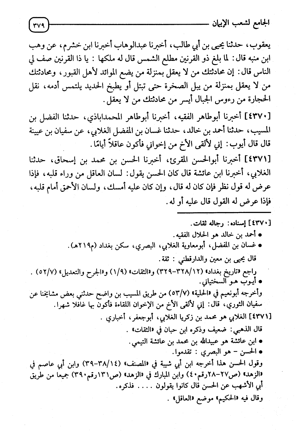 4370 - أَخْبَرَنَا أَبُو طَاهِرٍ الْفَقِيهُ، أَخْبَرَنَا أَبُو طَاهِرٍ الْمُحَمَّدُآبَاذِي، حَدَّثَنَا الْفَضْلُ بْنُ الْمُسَيَّبِ، حَدَّثَنَا أَحْمَدُ بْنُ خَالِدٍ، حَدَّثَنَا غَسَّانُ بْنُ الْمُفَضَّلِ الْغِلَابِيُّ، عَنْ سُفْيَانَ بْنِ عُيَيْنَةَ، قَالَ: قَالَ أَيُّوبُ: " §إِنِّي لَأَلْقَى الْأَخَ مِنْ إِخْوَانِي، فَأَكُونَ عَاقِلًا أَيَّامًا "