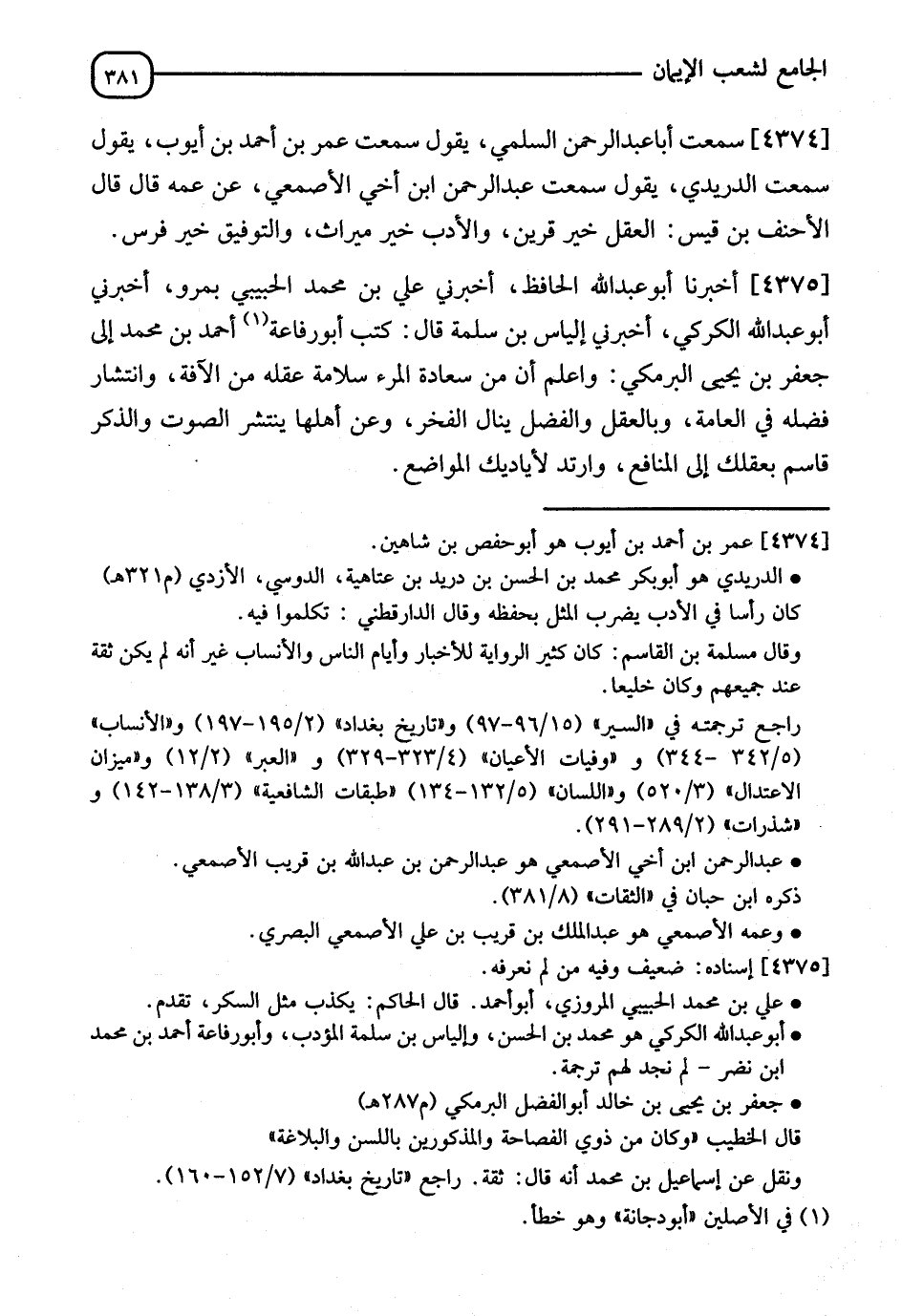 4374 - سَمِعْتُ أَبَا عَبْدِ الرَّحْمَنِ السُّلَمِيَّ، يَقُولُ: سَمِعْتُ عُمَرَ بْنَ أَحْمَدَ بْنِ أَيُّوبَ، يَقُولُ: سَمِعْتُ الدَّرِيدِيَّ، يَقُولُ: سَمِعْتُ عَبْدَ الرَّحْمَنِ ابْنَ أَخِي الْأَصمَعِيِّ، عَنْ عَمِّهِ، قَالَ: قَالَ الْأَحْنَفُ بْنُ قَيْسٍ: " §الْعَقْلُ خَيْرُ قَرِينٍ، وَالْأَدَبُ خَيْرُ مِيرَاثٍ، وَالتَّوْفِيقُ خَيْرُ فَرَسٍ "
