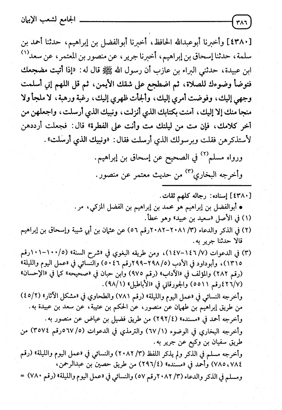 4380 - وَأَخْبَرَنَا أَبُو عَبْدَ اللهَ الْحَافِظُ، أنا أَبُو الْفَضْلِ بْنُ إِبْرَاهِيمَ، نا أَحْمَدُ بْنُ سَلَمَةَ، نا إِسْحَاقُ بْنُ إِبْرَاهِيمَ، نا جَرِيرٌ، عَنْ مَنْصُورِ بْنِ الْمُعْتَمِرِ، أن سَعْدُ بْنُ عُبَيْدَةَ، نا حَدَّثَنِي الْبَرَاءُ بْنُ عَازِبٍ، إنَّ رَسُولَ اللهِ صَلَّى اللَّهُ عَلَيْهِ وَسَلَّمَ قَالَ لَهُ: " §إِذَا أَتَيْتَ مَضْجَعَكَ فَتَوَضَّأْ وُضُوءَكَ لِلصلَاةِ، ثُمَّ اضْطَجَعَ عَلَى شِقِّكَ الْأَيْمَنِ، ثُمَّ قُلِ اللهُمَّ إِنِّي أَسْلَمْتُ وَجْهِي إِلَيْكَ، وَفَوَّضْتُ أَمْرِي إِلَيْكَ، وَأَلْجَأْتُ ظَهْرِي إِلَيْكَ رَغْبَةً وَرَهْبَةً إِلَيْكَ، لَا مَلْجَأَ وَلَا مَنْجَا مِنْكَ إِلَّا إِلَيْكَ آمَنْتُ بِكِتَابِكَ الَّذِي أَنْزَلْتَ وَنَبِيِّكَ الَّذِي أَرْسَلْتَ. وَاجْعَلْهُنَّ مِنْ آخِرِ كَلَامِكَ فَإِنْ مِتَّ مِنْ لَيْلَتِكَ مِتَّ وَأَنْتَ عَلَى الْفِطْرَةِ "، قَالَ: فَجَعَلْتُ أُرَدِّدُهُنَّ لِأَسْتَذْكِرَهُنَّ فَقُلْتُ: وَبِرَسُولِكَ الَّذِي أَرْسَلْتَ. فَقَالَ: " وَنَبِيِّكَ الَّذِي أَرْسَلْتَ " وَرَوَاهُ مُسْلِمٌ فِي الصحِيحِ، عَنْ إِسْحَاقَ بْنِ إِبْرَاهِيمَ. وَأَخْرَجَهُ الْبُخَارِيُّ، مِنْ حَدِيثِ مُعْتَمِرٍ، عَنْ مَنْصُورٍ. -[387]- وَرُوِّينَا فِي حَدِيثِ فِطْرِ بْنِ خَلِيفَةَ، عَنْ سَعْدِ بْنِ عُبَيْدَةَ، عَنِ الْبَرَاءِ، عَنِ النَّبِيِّ صَلَّى اللَّهُ عَلَيْهِ وَسَلَّمَ قَالَ: " إِذَا أَوَيْتَ إِلَى فِرَاشِكَ طَاهِرًا مُتَوَسِّدَ يَمِينِكَ، ثُمَّ قُلْ " فَذَكَرَ الدُّعَاءَ "