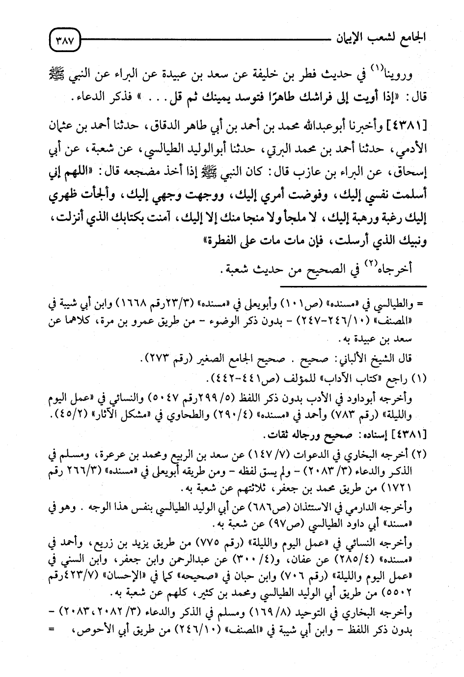 4381 - وَأَخْبَرَنَا أَبُو عَبْدِ اللهِ مُحَمَّدُ بْنُ أَبِي طَاهِرٍ الدَّقَّاقُ، نا أَحْمَدُ بْنُ عُثْمَانَ الْأَدَمِيُّ، نا أَحْمَدُ بْنُ مُحَمَّدٍ الْبَرْقِيُّ، نا أَبُو الْوَلِيدِ الطَّيَالِسِيُّ، عَنْ شُعْبَةَ، عَنْ أَبِي إِسْحَاقَ، عَنِ الْبَرَاءِ بْنِ عَازِبٍ، قَالَ: كَانَ النَّبِيُّ صَلَّى اللَّهُ عَلَيْهِ وَسَلَّمَ إِذَا أَخَذَ مَضْجَعَهُ، قَالَ: " §اللهُمَّ إِنِّي أَسْلَمْتُ نَفْسِي إِلَيْكَ، وَفَوَّضْتُ أَمْرِي إِلَيْكَ، وَوَجَّهْتُ وَجْهِي إِلَيْكَ، وَأَلْجَأْتُ ظَهْرِي إِلَيْكَ رَغْبَةً وَرَهْبَةً إِلَيْكَ، لَا مَلْجَأَ وَلَا مَنْجَا مِنْكَ إِلَّا إِلَيْكَ آمَنْتُ بِكِتَابِكَ الَّذِي أَنْزَلْتَ وَنَبِيِّكَ الَّذِي أَرْسَلْتَ، فَإِنْ مَاتَ مَاتَ عَلَى الْفِطْرَةِ " أَخْرَجَاهُ فِي الصحِيحِ، مِنْ حَدِيثِ شُعْبَةَ