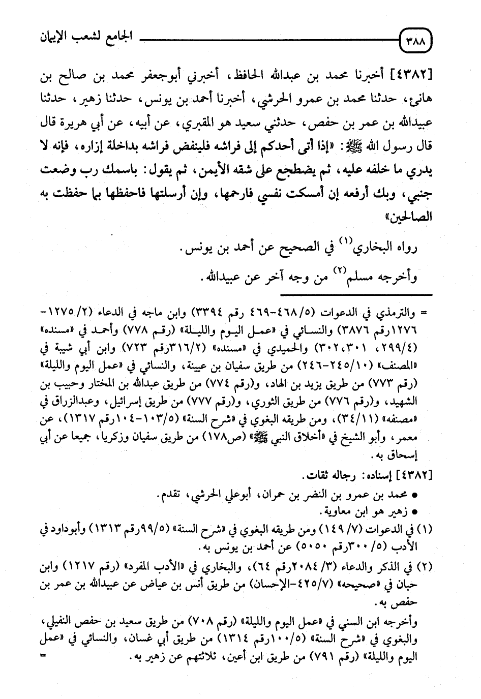 4382 - أَخْبَرَنَا مُحَمَّدُ بْنُ عَبْدِ اللهِ الْحَافِظُ، أَخْبَرَنِي أَبُو جَعْفَرٍ مُحَمَّدُ بْنُ صَالِحِ بْنِ هَانِئٍ، نا مُحَمَّدُ بْنُ عَمْرٍو الْحُوشِيُّ، أنا أَحْمَدُ بْنُ يُونُسَ، نا زُهَيْرٌ، نا عُبَيْدُ اللهِ بْنُ عُمَرَ بْنِ حَفْصٍ، حَدَّثَنِي سَعِيدٌ هُوَ الْمَقْبُرِيُّ، عَنْ أَبِيهِ، عَنْ أَبِي هُرَيْرَةَ، قَالَ: قَالَ رَسُولُ اللهِ صَلَّى اللَّهُ عَلَيْهِ وَسَلَّمَ: " §إِذَا أَتَى أَحَدُكُمْ إِلَى فِرَاشِهِ، فَلْيَنْفُضْ فِرَاشَهُ بِدَاخِلَةِ إِزَارِهِ، كَأَنَّهُ لَا يَدْرِي مَا خَلَفَهُ عَلَيْهِ، ثُمَّ يَضْطَجِعْ عَلَى شِقِّهِ الْأَيْمَنِ، ثُمَّ يَقُولُ: بِاسْمِكَ رَبِّ وَضَعْتُ جَنْبِي، وَبِكَ أَرْفَعُهُ إِنْ أَمْسَكْتَ نَفْسِي فَارْحَمْهَا، وَإِنْ أَرْسلْتَهَا فَاحْفَظْهَا بِمَا تَحْفَظُ بِهِ الصَّالِحِينَ " رَوَاهُ الْبُخَارِيُّ فِي الصحِيحِ، عَنْ أَحْمَدَ بْنِ يُونُسَ. وَأَخْرَجَهُ مُسْلِمٌ مِنْ وَجْهٍ آخَرَ عَنْ عُبَيْدِ اللهِ