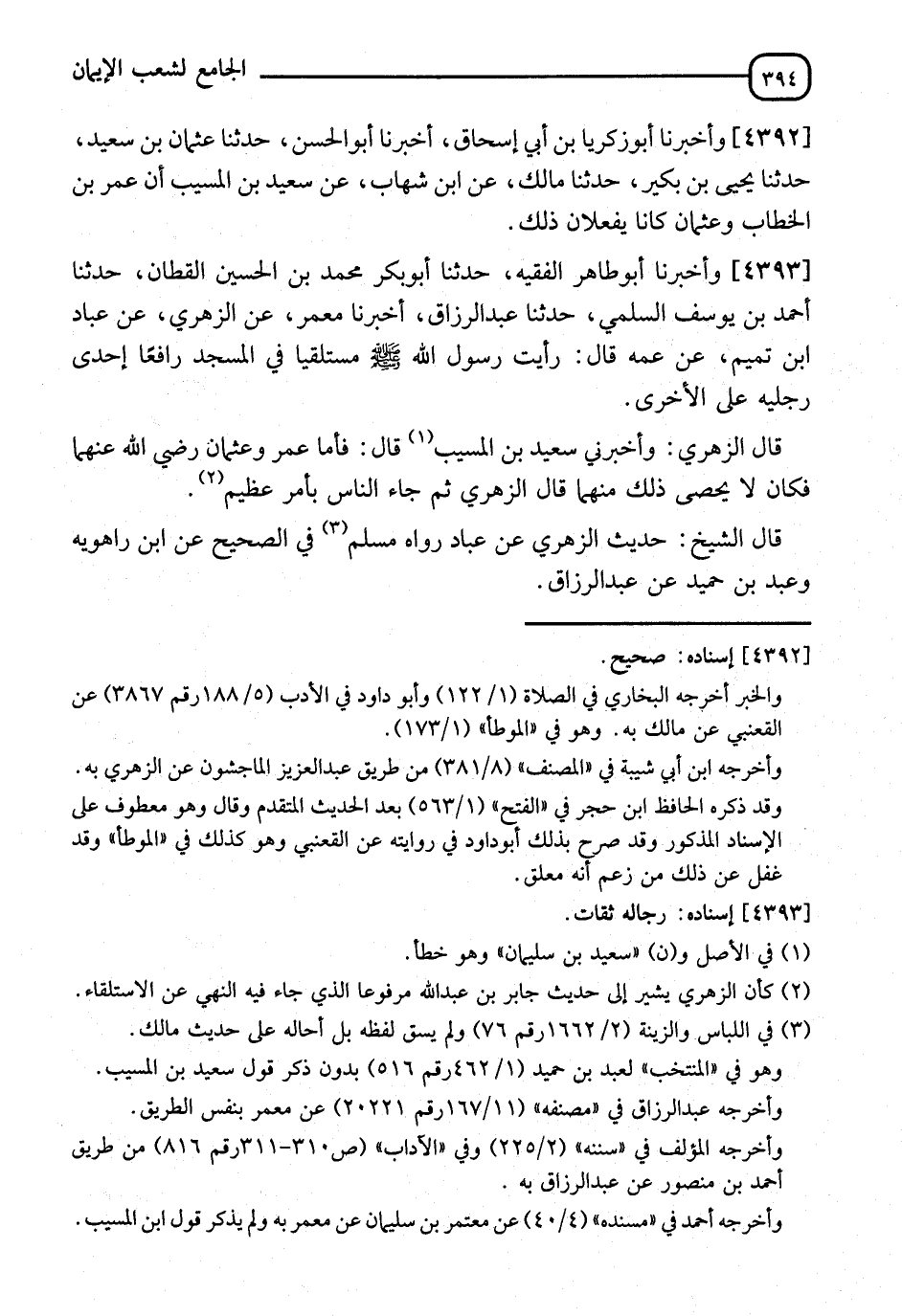 4393 - وَأَخْبَرَنَا أَبُو طَاهِرٍ الْفَقِيهُ، أنا أَبُو بَكْرٍ مُحَمَّدُ بْنُ الْحُسَيْنِ الْقَطَّانُ، نا أَحْمَدُ بْنُ يُوسُفَ السُّلَمِيُّ، نا عَبْدُ الرَّزَّاقِ، أنا مَعْمَرٌ، عَنِ الزُّهْرِيِّ، عَنْ عَبَّادِ بْنِ تَمِيمٍ، عَنْ عَمِّهِ، قَالَ: §" رَأَيْتُ رَسُولَ اللهِ صَلَّى اللَّهُ عَلَيْهِ وَسَلَّمَ مُسْتَلْقِيًا فِي الْمَسْجِدِ رَافِعًا إِحْدَى رِجْلَيْهِ عَلَى الْأُخْرَى " قَالَ الزُّهْرِيُّ. وَأَخْبَرَنَا سَعِيدُ بْنُ سُلَيْمَانَ، قَالَ: فَأَمَّا عُمَرُ وَعُثْمَانُ رَضِيَ اللهُ عَنْهُمَا فَكَانَ لَا يُحْصي ذَلِكَ مِنْهُمَا ". قَالَ الزُّهْرِيُّ: ثُمَّ جَاءَ النَّاسِ بِأَمْرٍ عَظِيمٍ. قَالَ الشَّيْخُ: حَدِيثُ الزُّهْرِيِّ، عَنْ عَبَّادٍ. رَوَاهُ مُسْلِمٌ فِي الصحِيحِ، عَنِ ابْنِ رَاهُوَيْهِ، وَعَبْدُ بْنُ حُمَيْدٍ، عَنْ عَبْدِ الرَّزَّاقِ