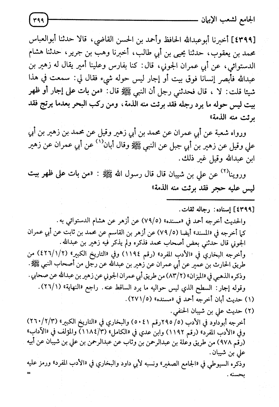 وَرُوِّينَا عَنْ عَلِيِّ بْنِ شَيْبَانَ، قَالَ: قَالَ رَسُولُ اللهِ صَلَّى اللَّهُ عَلَيْهِ وَسَلَّمَ: " §مَنْ بَاتَ عَلَى ظَهْرِ بَيْتٍ لَيْسَ عَلَيْهِ حَجَرٌ، فَقَدْ بَرِئَتْ مِنْهُ الذِّمَّةُ "