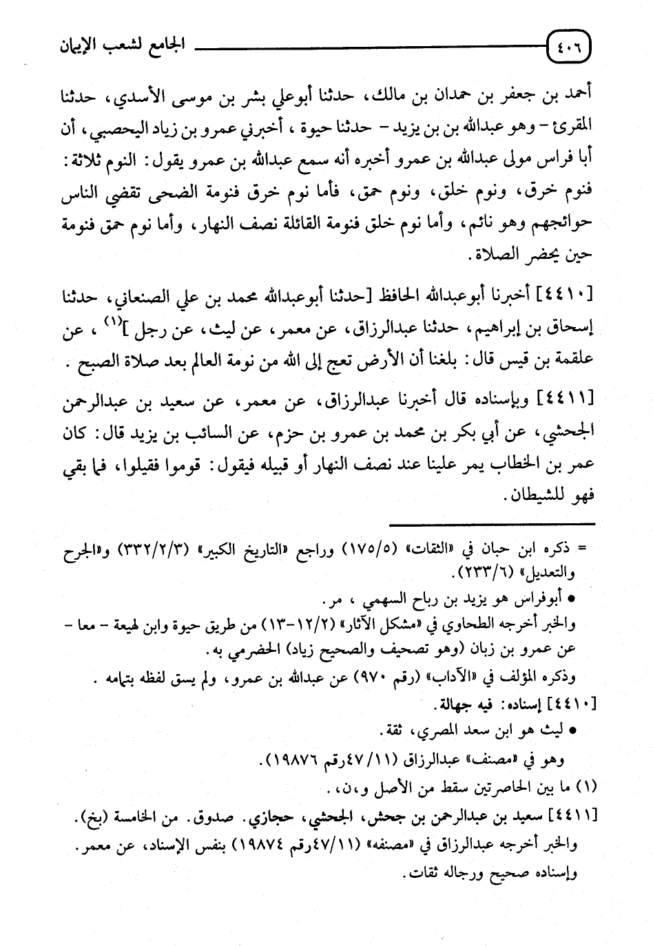 4410 - أَخْبَرَنَا أَبُو عَبْدِ اللهِ الْحَافِظُ، عَنْ عَلْقَمَةَ بْنِ قَيْسٍ، قَالَ: بَلَغَنَا " أَنَّ §الْأَرْضَ تَعُجُّ إِلَى اللهِ مِنْ نَوْمَةِ الْعَالِمِ بَعْدَ صلَاةِ الصبْحِ "