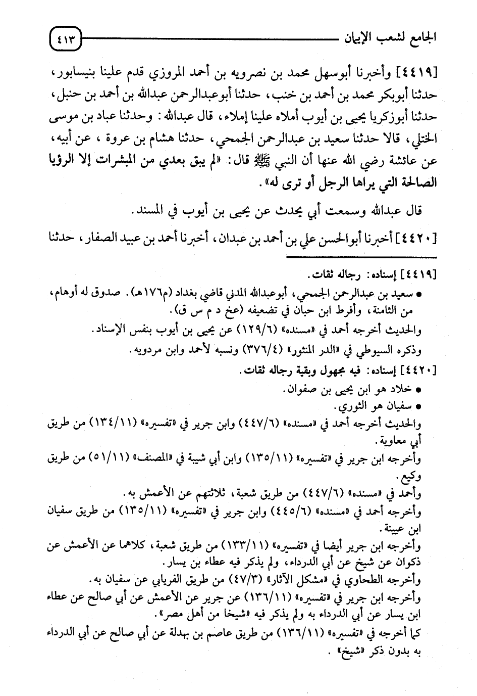 4419 - وَأَخْبَرَنَا أَبُو سَهْلٍ مُحَمَّدُ بْنُ نَصرَوَيْهِ بْنِ أَحْمَدَ الْمَرْوَزِيُّ، قَدِمَ عَلَيْنَا نَيْسَابُورَ، نا أَبُو بَكْرٍ مُحَمَّدُ بْنُ أَحْمَدَ بْنِ خَنْبٍ، نا أَبُو عَبْدِ الرَّحْمَنِ عَبْدُ اللهِ بْنُ أَحْمَدَ بْنِ حَنْبَلٍ، نا أَبُو زَكَرِيَّا يَحْيَى بْنُ أَيُّوبَ، أَمْلَاهُ عَلَيْنَا إِمْلَاءً، قَالَ عَبْدُ اللهِ: وَنا عَبَّادُ بْنُ مُوسَى الْخُتُلِّيُّ، قَالَا: نا سَعِيدُ بْنُ عَبْدِ الرَّحْمَنِ الْجُمَحِيُّ، نا هِشَامُ بْنُ عُرْوَةَ، عَنْ أَبِيهِ، عَنْ عَائِشَةَ رَضِيَ اللهُ عَنْهَا، أَنَّ النَّبِيَّ صَلَّى اللَّهُ عَلَيْهِ وَسَلَّمَ قَالَ: " §لَمْ يَبْقَ بَعْدِي مِنَ الْمُبَشِّرَاتِ إِلَّا الرُّؤْيَا الصَّالِحَةُ، يَرَاهَا الرَّجُلُ أَوْ تُرَى لَهُ " قَالَ عَبْدُ اللهِ: وَسَمِعْتُ أَبِي يُحَدِّثُ، عَنْ يَحْيَى بْنِ أَيُّوبَ فِي الْمُسْنَدِ