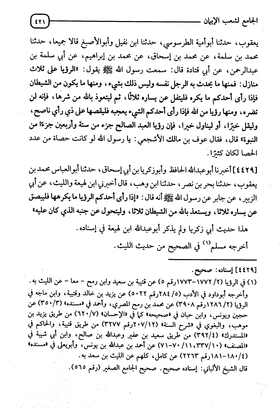 4429 - أَخْبَرَنَا أَبُو عَبْدِ اللهِ الْحَافِظُ، وَأَبُو زَكَرِيَّا بْنُ أَبِي إِسْحَاقَ، نا أَبُو الْعَبَّاسِ مُحَمَّدُ بْنُ يَعْقُوبَ، نا بَحْرُ بْنُ نَصرٍ، نا ابْنُ وَهْبٍ، قَالَ: أَخْبَرَنِي ابْنُ لَهِيعَةَ، وَاللَّيْثُ، عَنْ أَبِي الزُّبَيْرِ، عَنْ جَابِرٍ، عَنْ رَسُولِ اللهِ صَلَّى اللَّهُ عَلَيْهِ وَسَلَّمَ أَنَّهُ قَالَ: " §إِذَا رَأَى أَحَدُكُمُ الرُّؤْيَا يَكْرَهُهَا، فَلْيَبْصقْ عَنْ يَسَارِهِ ثَلَاثًا، وَلْيَسْتَعِذْ بِاللهِ مِنَ الشَّيْطَانِ ثَلَاثًا، وَلْيَتَحَوَّلْ عَنْ جَنْبِهِ الَّذِي كَانَ عَلَيْهِ ". " هَذَا حَدِيثُ أَبِي زَكَرِيَّا وَلَمْ يَذْكُرْ أَبُو عَبْدِ اللهِ ابْنَ لَهِيعَةَ فِي إِسْنَادِهِ ". أَخْرَجَهُ مُسْلِمٌ فِي الصحِيحِ، مِنْ حَدِيثِ اللَّيْثِ