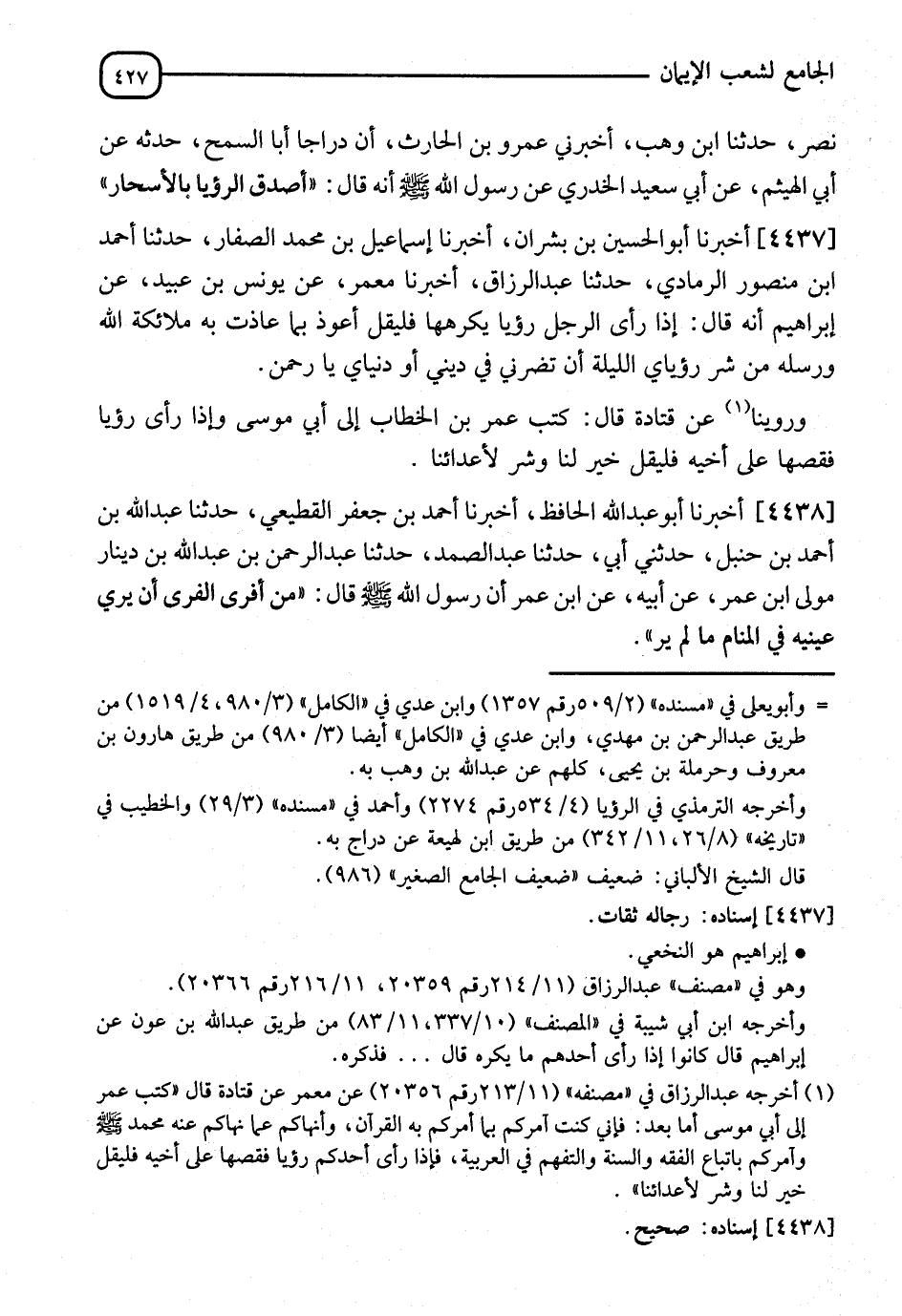 4438 - أَخْبَرَنَا أَبُو عَبْدِ اللهِ الْحَافِظُ، أنا أَحْمَدُ بْنُ جَعْفَرٍ الْقَطِيعِيُّ، نا عَبْدُ اللهِ بْنُ أَحْمَدَ بْنِ حَنْبَلٍ، حَدَّثَنِي أَبِي، نا عَبْدُ الصمَدِ، نا عَبْدُ الرَّحْمَنِ بْنُ عَبْدِ اللهِ بْنِ دِينَارٍ، مَوْلَى ابْنِ عُمَرَ، عَنْ أَبِيهِ، عَنِ ابْنِ عُمَرَ، أَنَّ رَسُولَ اللهِ صَلَّى اللَّهُ عَلَيْهِ وَسَلَّمَ قَالَ: " إِنَّ §مِنْ أَفْرَى الْفِرَى أَنْ يُرِيَ عَيْنَيْهِ فِي الْمَنَامِ مَا لَمْ يَرَى " -[428]- رَوَاهُ الْبُخَارِيُّ فِي الصحِيحِ، عَنْ عَلِيِّ بْنِ مُسْلِمٍ، عَنْ عَبْدِ الصمَدِ بْنِ عَبْدِ الْوَارِثِ
