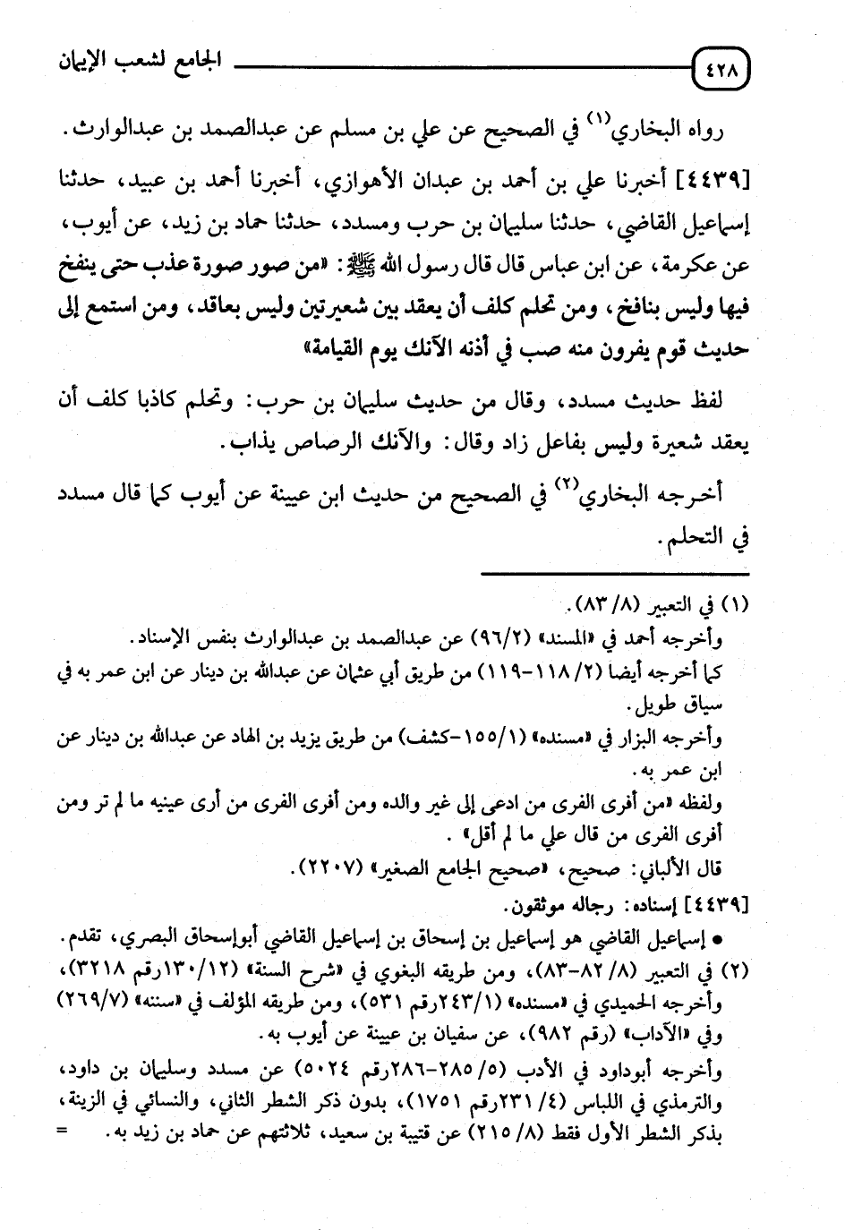 4439 - أَخْبَرَنَا عَلِيُّ بْنُ أَحْمَدَ بْنِ عَبْدَانَ الْأَهْوَازِيُّ، أنا أَحْمَدُ بْنُ عُبَيْدٍ، نا إِسْمَاعِيلُ الْقَاضِي، نا سُلَيْمَانُ بْنُ حَرْبٍ، وَمُسَدَّدٌ، نا حَمَّادُ بْنُ زَيْدٍ، عَنْ أَيُّوبَ، عَنْ عِكْرِمَةَ، عَنِ ابْنِ عَبَّاسٍ، قَالَ: قَالَ رَسُولُ اللهِ صَلَّى اللَّهُ عَلَيْهِ وَسَلَّمَ: " §مِنْ صَوَّرَ صُورَةً عُذِّبَ حَتَّى يَنْفُخَ فِيهَا وَلَيْسَ بِنَافِخٍ، وَمَنْ تَحَلَّمَ كُلِّفَ أَنْ يَعْقِدَ بَيْنَ شَعِيرَتَيْنِ وَلَيْسَ بِعَاقِدٍ، وَمَنِ اسْتَمَعَ إِلَى حَدِيثِ قَوْمٍ يَفِرُّونَ مِنْهُ صبَّ فِي أُذُنِهِ الْآنِكُ يَوْمَ الْقِيَامَةِ " " لَفْظُ حَدِيثِ مُسَدَّدٍ ". وَقَالَ فِي حَدِيثِ سُلَيْمَانَ بْنِ حَرْبٍ، " وَمَنْ تَحَلَّمَ كَاذِبًا كُلِّفَ أَنْ يَعْقِدَ شَعِيرَةً، وَلَيْسَ بِفَاعِلٍ "، زَادَ وَقَالَ: " وَالْآنِكُ الرَّصَاصِ يُذَابُ ". أَخْرَجَهُ الْبُخَارِيُّ فِي الصحِيحِ، مِنْ حَدِيثِ ابْنِ عُيَيْنَةَ، عَنْ أَيُّوبَ كَمَا قَالَ مُسَدَّدٌ فِي التَّحَلُّمِ