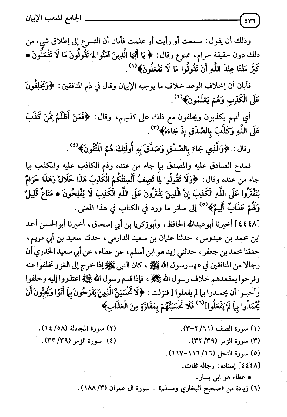 وَذَلِكَ أَنْ يَقُولَ سَمِعْتُ أَوْ رَأَيْتُ أوْ عَلِمْتُ فَأَبَانَ أَنَّ التَّسَرُّعَ إِلَى إِطْلَاقِ شَيْءٍ مِنْ ذَلِكَ دُونَ حَقِيقَتِهِ حَرَامٌ مَمْنُوعٌ، وَقَالَ: {يَا أَيُّهَا الَّذِينَ آمَنُوا لِمَ تَقُولُونَ مَا لَا تَفْعَلُونَ كَبُرَ مَقْتًا عِنْدَ اللهِ أَنْ تَقُولُوا مَا لَا تَفْعَلُونَ} [الصف: 3] فَأَبَانَ أَنَّ إِخْلَافَ الْوَعْدِ خِلَافُ مَا يُوجِبُهُ الْإِيمَانُ وَقَالَ فِي ذَمِّ الْمُنَافِقِينَ {وَيَحْلِفُونَ عَلَى الْكَذِبِ وَهُمْ يَعْلَمُونَ} [المجادلة: 14] أَيْ أَنَّهُمْ يَكْذِبُونَ وَيَحْلِفُونَ مَعَ ذَلِكَ عَلَى كَذِبِهِمْ، وَقَالَ: {فَمَنْ أَظْلَمُ مِمَّنْ كَذَبَ عَلَى اللهِ وَكَذَّبَ بِالصِّدْقِ إِذْ جَاءَهُ} [الزمر: 32]. وَقَالَ " {وَالَّذِي جَاءَ بِالصِّدْقِ وَصدَّقَ بِهِ أُولَئِكَ هُمُ الْمُتَّقُونَ} [الزمر: 33] فَمَدَحَ الصَّادِقَ عَلَيْهِ وَالْمُصدِّقَ بِمَا جَاءَ مِنْ عِنْدِهِ وَذَمَّ الْكَاذِبَ عَلَيْهِ وَالْمُكَذِّبَ بِمَا جَاءَ مِنْ عِنْدِهِ، وَقَالَ: {وَلَا تَقُولُوا لِمَا تَصفُ أَلْسِنَتُكُمُ الْكَذِبَ هَذَا حَلَالٌ وَهَذَا حَرَامٌ لِتَفْتَرُوا عَلَى اللهِ الْكَذِبَ إِنَّ الَّذِينَ يَفْتَرُونَ عَلَى اللهِ الْكَذِبَ لَا يُفْلِحُونَ مَتَاعٌ قَلِيلٌ وَلَهُمْ عَذَابٌ أَلِيمٌ} [النحل: 116] إِلَى سَائِرِ مَا وَرَدَ فِي الْكِتَابِ فِي هَذَا الْمَعْنَى "