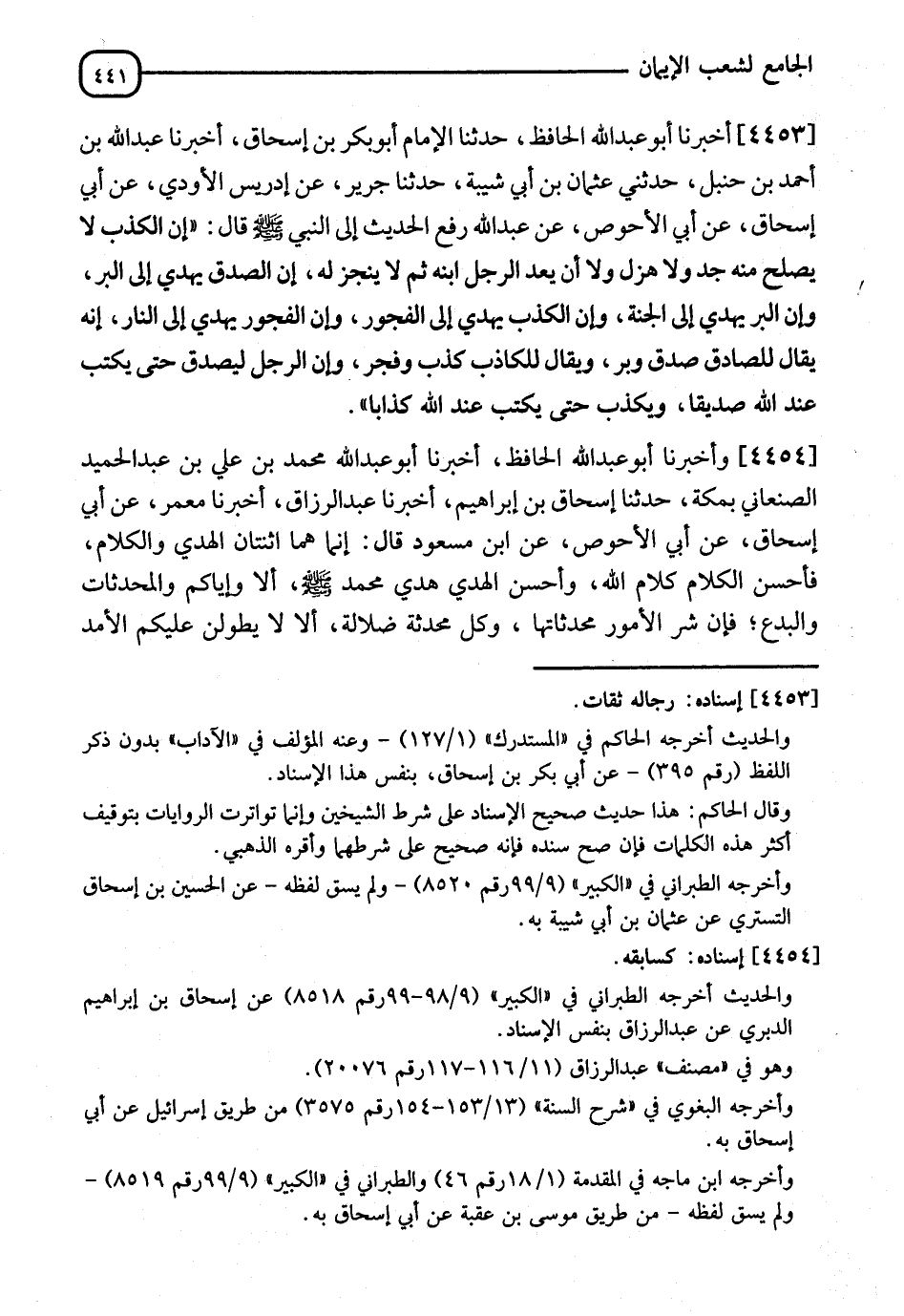 4453 - أَخْبَرَنَا أَبُو عَبْدِ اللهِ الْحَافِظُ، أنا الْإِمَامُ أَبُو بَكْرِ بْنِ إِسْحَاقَ، أنا عَبْدُ اللهِ بْنُ أَحْمَدَ بْنِ حَنْبَلٍ، حَدَّثَنِي عُثْمَانُ بْنُ أَبِي شَيْبَةَ، نا جَرِيرٌ، عَنْ إِدْرِيسَ الْأَوْدِيِّ، عَنْ أَبِي إِسْحَاقَ، عَنْ أَبِي الْأَحْوَصِ، عَنْ عَبْدِ اللهِ، رَفَعَ الْحَدِيثَ إِلَى النَّبِيِّ صَلَّى اللَّهُ عَلَيْهِ وَسَلَّمَ قَالَ: " إِنَّ §الْكَذِبَ لَا يَصلُحُ مِنْهُ جَدٌّ وَلَا هَزْلٌ، وَلَا أَنْ يَعِدَ الرَّجُلُ ابْنَهُ، ثُمَّ لَا يُنْجِزُ لَهُ، إِنَّ الصِّدْقَ يَهْدِي إِلَى الْبِرِّ، وَإِنَّ الْبِرَّ يَهْدِي إِلَى الْجَنَّةِ، وَإِنَّ الْكَذِبَ يَهْدِي إِلَى الْفُجُورَ، وَإِنَّ الْفُجُورَ يَهْدِي إِلَى النَّارِ، إِنَّهُ يُقَالُ لِلصَّادِقِ صَدَقَ وَبَرَّ، وَيُقَالُ لِلْكَاذِبِ كَذَبَ وَفَجَرَ، وَإِنَّ الرَّجُلَ لَيَصْدُقُ حَتَّى يُكْتَبَ عِنْدَ اللهِ صدِّيقًا، وَيَكْذِبُ حَتَّى يُكْتَبَ عِنْدَ اللهِ كَذَّابًا "
