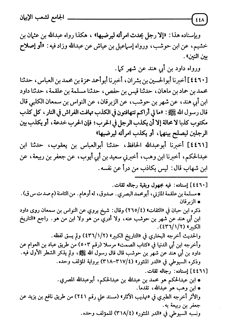 4460 - أَخْبَرَنَا أَبُو الْحُسَيْنِ بْنُ بِشْرَانَ، أنا أَبُو أَحْمَدَ حَمْزَةُ بْنُ الْعَبَّاسِ، نا مُحَمَّدُ بْنُ حَمَّادِ بْنِ مَاهَانَ، نا قَيْسُ بْنُ حَفْصٍ، نا مَسْلَمَةُ بْنُ عَلْقَمَةَ، نا دَاوُدُ بْنُ أَبِي هِنْدَ، عَنْ شَهْرِ بْنِ حَوْشَبٍ، عَنِ الزِّبْرِقَانِ، عَنِ النَّوَّاسِ بْنِ سَمْعَانَ الْكِلَابِيِّ، قَالَ: قَالَ رَسُولُ اللهِ صَلَّى اللَّهُ عَلَيْهِ وَسَلَّمَ: " مَا لِي أَرَاكُمْ تَتَهَافَتُونَ فِي الْكَذِبِ، تَهَافُتَ الْفَرَاشِ فِي النَّارِ §كُلُّ الْكَذِبِ مَكْتُوبٌ كَذِبًا لَا مَحَالَةَ، إِلَّا أَنْ يَكْذِبَ الرَّجُلُ فِي الْحَرْبِ، فَإِنَّ الْحَرْبَ خُدْعَةٌ، أَوْ يَكْذِبَ بَيْنَ الرِّجْلَيْنِ لِيُصلِحَ بَيْنَهُمَا، أَوْ يَكْذِبَ عَلَى امْرَأَتِهِ لِيُرْضِيَهَا "