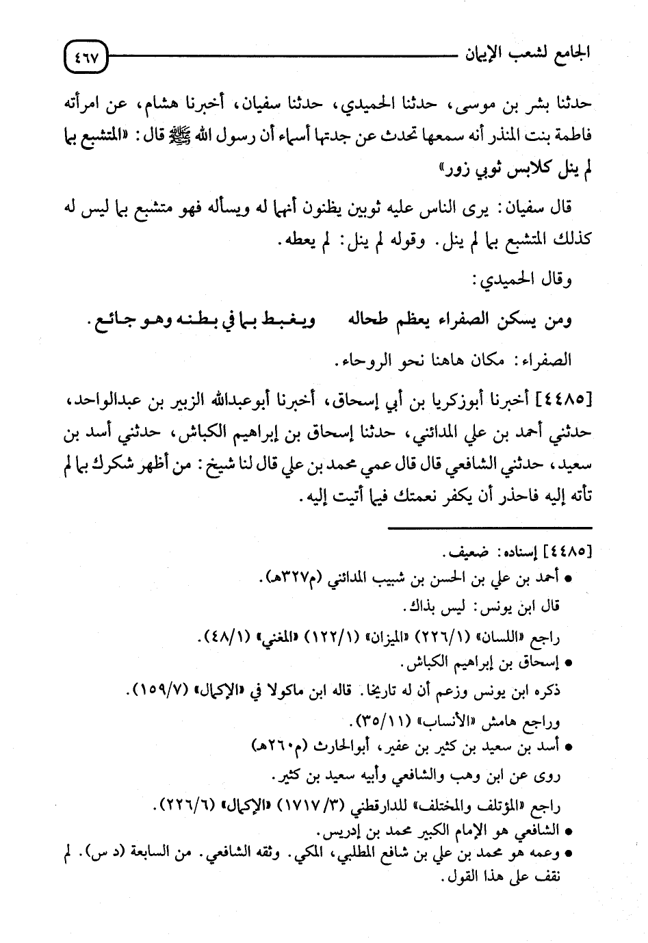 4485 - أَخْبَرَنَا أَبُو زَكَرِيَّا بْنُ أَبِي إِسْحَاقَ، أنا عَبْدُ اللهِ الزُّبَيْرُ بْنُ عَبْدِ الْوَاحِدِ، حَدَّثَنِي أَحْمَدُ بْنُ عَلِيٍّ الْمَدَائِنِيُّ، نا إِسْحَاقُ بْنُ إِبْرَاهِيمَ الْكَبَّاشُ، حَدَّثَنِي أُسَيْدُ بْنُ سَعِيدٍ، حَدَّثَنِي الشَّافِعِيُّ، قَالَ: قَالَ عَمِّي مُحَمَّدُ بْنُ عَلِيٍّ: قَالَ لَنَا شَيْخٌ: " §مَنْ أَظْهَرَ شُكْرَكَ بِمَا لَمْ تَأْتِهِ إِلَيْهِ، فَاحْذَرْ أَنْ يَكْفُرَ نِعْمَتَكَ فِيمَا أَتَيْتَ إِلَيْهِ "