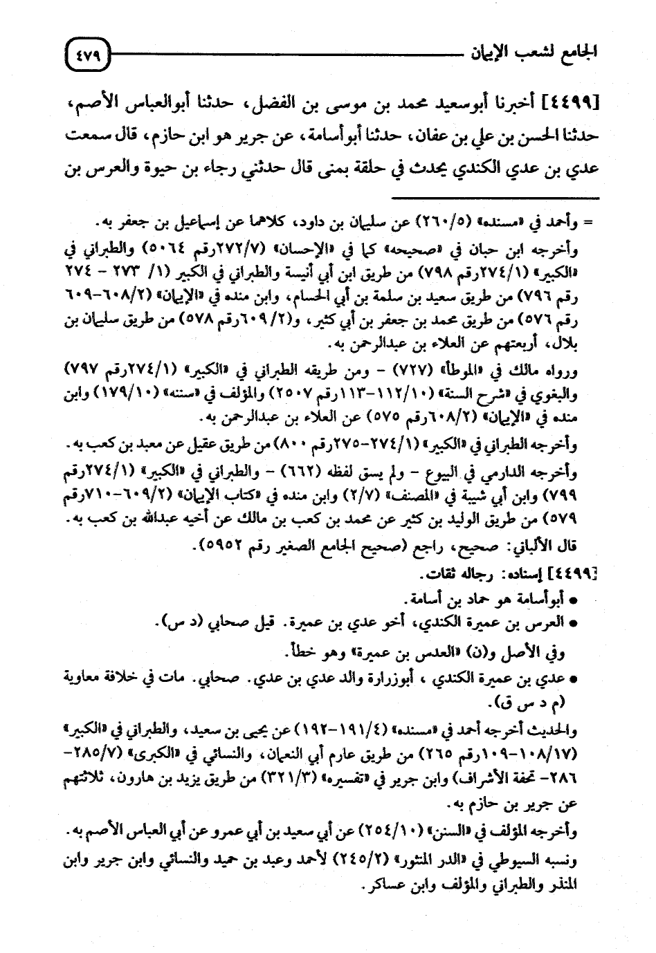 4499 - أَخْبَرَنَا أَبُو سَعِيدٍ مُحَمَّدُ بْنُ مُوسَى بْنُ الْفَضْلِ، نا أَبُو الْعَبَّاسِ الْأَصمُّ، نا الْحَسَنُ بْنُ عَلِيِّ بْنِ عَفَّانَ، نا أَبُو أُسَامَةَ، عَنْ جَرِيرٍ هُوَ ابْنُ حَازِمٍ، قَالَ: سَمِعْتُ عَدِيَّ بْنَ عَدِيٍّ الْكِنْدِيَّ، يُحَدِّثُ فِي حَلْقَةٍ بِمَنًى، قَالَ: حَدَّثَنِي رَجَاءُ بْنُ حَيْوَةَ، وَالْعُرْسُ بْنُ -[480]- عُمَيْرَةَ، عَنْ عَدِيِّ بْنِ عُمَيْرَةَ الْكِنْدِيِّ، أَنَّ امْرَأَ الْقَيْسِ بْنِ عَابِسٍ الْكِنْدِيَّ خَاصمَ إِلَى رَسُولِ اللهِ صَلَّى اللَّهُ عَلَيْهِ وَسَلَّمَ رَجُلًا مِنْ حَضْرَمَوْتَ فِي أَرْضٍ، قَالَ رَسُولُ اللهِ صَلَّى اللَّهُ عَلَيْهِ وَسَلَّمَ لِلْحَضْرَمِيِّ: " الْبَيِّنَةَ "، فَلَمْ تَكُنْ لَهُ بَيِّنَةٌ فَقَضَى عَلَى امْرِئِ الْقَيْسِ بِالْيَمِينِ، فَقَالَ الْحَضْرَمِيُّ: أَمْكَنْتَهُ يَا رَسُولَ اللهِ مِنَ الْيَمِينِ ذَهَبَ وَاللهِ أَرْضِي، فَقَالَ رَسُولُ اللهِ صَلَّى اللَّهُ عَلَيْهِ وَسَلَّمَ: §" مَنْ حَلَفَ عَلَى يَمِينٍ كَاذِبَةٍ لِيَقْتَطِعَ بِهَا مَالَ أَخِيهِ لَقِيَ اللهَ عَزَّ وَجَلَّ يَوْمَ يَلْقَاهُ وَهُوَ عَلَيْهِ غَضْبَانُ " قَالَ: وَقَالَ رَجَاءُ: وَتَلَا رَسُولُ اللهِ صَلَّى اللَّهُ عَلَيْهِ وَسَلَّمَ: {إِنَّ الَّذِينَ يَشْتَرُونَ بِعَهْدِ اللهِ وَأَيْمَانِهِمْ ثَمَنًا قَلِيلًا} [آل عمران: 77] إِلَى آخِرِ الْآيَةِ، فَقَالَ امْرُؤُ الْقَيْسِ: فَمَاذَا لِمَنْ تَرَكَهَا؟ قَالَ لَهُ: " الْجَنَّةُ "، قَالَ: فَإِنِّي أُشْهِدُكَ أَنِّي قَدْ تَرَكْتُهَا
