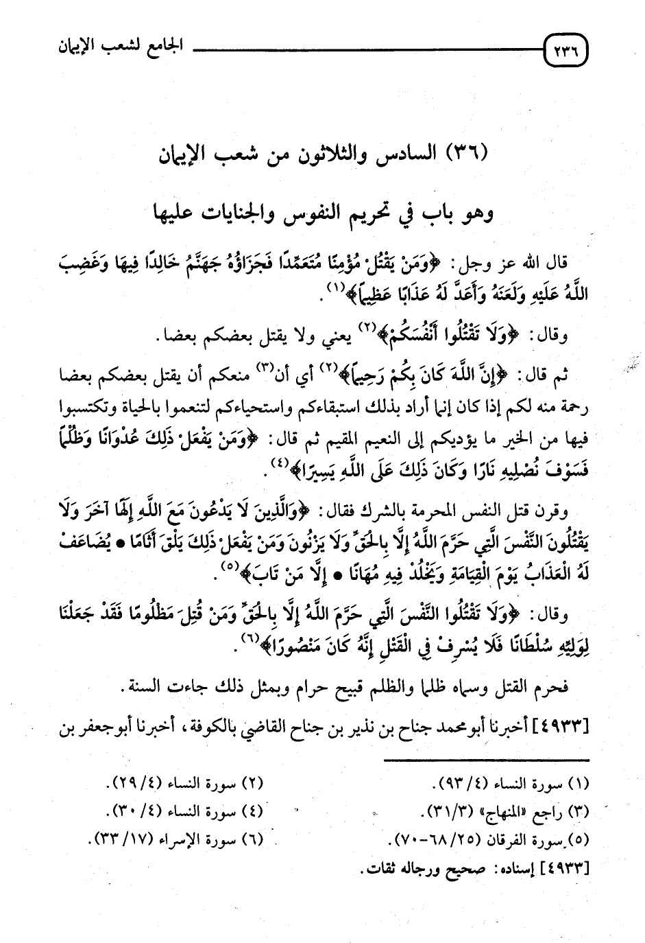 §السَّادِسُ وَالثَّلَاثُونَ مِنْ شُعَبِ الْإِيمَانِ وَهُوَ بَابٌ فِي تَحْرِيمِ النُّفُوسِ وَالْجِنَايَاتِ عَلَيْهَا " قَالَ اللهُ عَزَّ وَجَلَّ: {وَمَنْ يَقْتُلْ مُؤْمِنًا مُتَعَمِّدًا فَجَزَاؤُهُ جَهَنَّمُ خَالِدًا فِيهَا وَغَضِبَ اللهُ عَلَيْهِ وَلَعَنَهُ وَأَعَدَّ لَهُ عَذَابًا عَظِيمًا} [النساء: 93]. قَالَ: {وَلَا تَقْتُلُوا أَنْفُسَكُمْ} [النساء: 29] يَعْنِي وَلَا يَقْتُلْ بَعْضُكُمْ بَعْضًا، ثُمَّ قَالَ: {إِنَّ اللهَ كَانَ بِكُمْ رَحِيمًا} [النساء: 29] أَيْ أَنْ مَنَعَكُمْ أَنْ يَقْتُلَ بَعْضُكُمْ بَعْضًا رَحْمَةً مِنْهُ لَكُمْ، إِذَا كَانَ، إِنَّمَا أَرَادَ بِذَلِكَ اسْتِبْقَاءَكُمْ وَاسْتِحْيَاءَكُمْ لِتَنْعَمُوا بِالْحَيَاةِ الدُّنْيَا، وَتَكْتِسُبُوا فِيهَا مِنَ الْخَيْرِ مَا يُؤَدِّيكُمْ إِلَى النَّعِيمِ الْمُقِيمِ، ثُمَّ قَالَ: {وَمَنْ يَفْعَلْ ذَلِكَ عُدْوَانًا وَظُلْمًا فَسَوْفَ نُصْلِيهِ نَارًا وَكَانَ ذَلِكَ عَلَى اللهِ يَسِيرًا} [النساء: 30] وَقَرَنَ قَتْلَ النَّفْسِ الْمُحْرِمَةِ بِالشِّرْكِ. فَقَالَ: {وَالَّذِينَ لَا يَدْعُونَ مَعَ اللهِ إِلَهًا آخَرَ وَلَا يَقْتُلُونَ النَّفْسَ الَّتِي حَرَّمَ اللهُ إِلَّا بِالْحَقِّ وَلَا يَزْنُونَ وَمَنْ يَفْعَلْ ذَلِكَ يَلْقَ أَثَامًا، يُضَاعَفْ لَهُ الْعَذَابُ يَوْمَ الْقِيَامَةِ وَيَخْلُدْ فِيهِ مُهَانًا، إِلَّا مَنْ تَابَ} [الفرقان: 69]. وَقَالَ: {وَلَا تَقْتُلُوا النَّفْسَ الَّتِي حَرَّمَ اللهُ إِلَّا بِالْحَقِّ وَمَنْ قُتِلَ مَظْلُومًا فَقَدْ جَعَلْنَا لِوَلِيِّهِ سُلْطَانًا فَلَا يُسْرِفْ فِي الْقَتْلِ إِنَّهُ كَانَ مَنْصُورًا} [الإسراء: 33] فَحَرَّمَ الْقَتْلَ وَسَمَّاهُ ظُلْمًا، وَالظُّلْمُ قَبِيحٌ حَرَامٌ، وَبِمِثْلِ ذَلِكَ جَاءَتِ السُّنَّةُ "