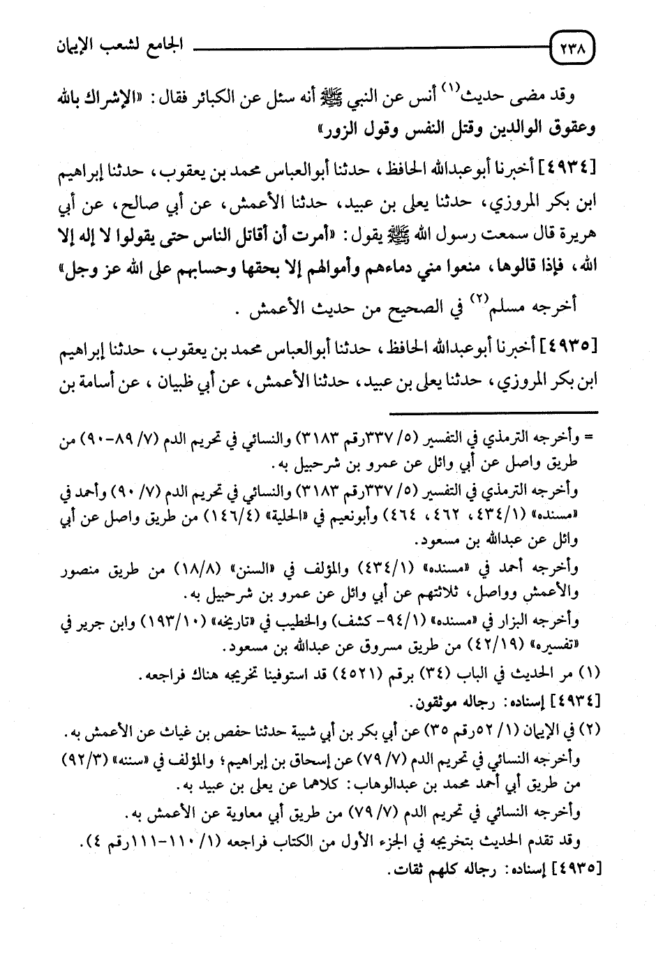 4934 - أَخْبَرَنَا أَبُو عَبْدِ اللهِ الْحَافِظُ، ثنا أَبُو الْعَبَّاسِ مُحَمَّدُ بْنُ يَعْقُوبَ، ثنا إِبْرَاهِيمُ بْنُ بَكْرٍ الْمَرْوَزِيُّ، ثنا يَعْلَى بْنُ عُبَيْدٍ، ثنا الْأَعْمَشُ، عَنْ أَبِي صَالِحٍ، عَنْ أَبِي هُرَيْرَةَ، قَالَ: سَمِعْتُ رَسُولَ اللهِ صَلَّى اللَّهُ عَلَيْهِ وَسَلَّمَ يَقُولُ: " §أُمِرْتُ أَنْ أُقَاتِلَ النَّاسَ حَتَّى يَقُولُوا: لَا إِلَهَ إِلَّا اللهُ، فَإِذَا قَالُوهَا مَنَعُوا مِنِّي دِمَاءَهُمْ وَأَمْوَالَهُمْ إِلَّا بِحَقِّهَا، وَحِسَابُهُمْ عَلَى اللهِ عَزَّ وَجَلَّ ". أَخْرَجَهُ مُسْلِمٌ فِي الصَّحِيحِ مِنْ حَدِيثِ الْأَعْمَشِ