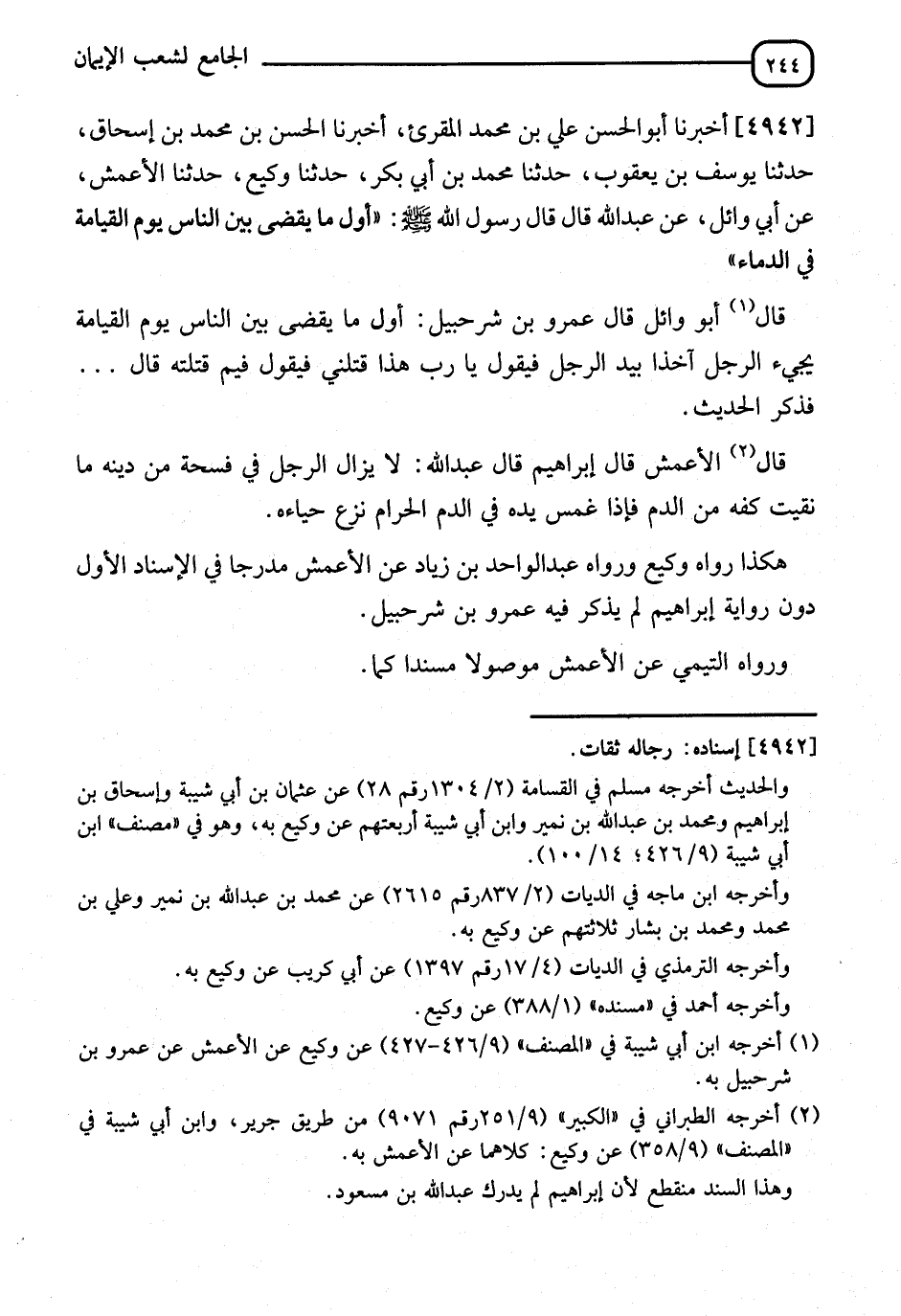 4942 - أَخْبَرَنَا أَبُو الْحَسَنِ عَلِيُّ بْنُ مُحَمَّدٍ الْمُقْرِئُ، أنا الْحَسَنُ بْنُ مُحَمَّدِ بْنِ إِسْحَاقَ، ثنا يُوسُفُ بْنُ يَعْقُوبَ، ثنا مُحَمَّدُ بْنُ أَبِي بَكْرٍ، ثنا وَكِيعٌ، ثنا الْأَعْمَشُ، عَنْ أَبِي وَائِلٍ، عَنْ عَبْدِ اللهِ، قَالَ: قَالَ رَسُولُ اللهِ صَلَّى اللَّهُ عَلَيْهِ وَسَلَّمَ: §" أَوَّلُ مَا يُقْضَى بَيْنَ النَّاسِ يَوْمَ الْقِيَامَةِ فِي الدِّمَاءِ " قَالَ أَبُو وَائِلٍ: قَالَ عَمْرُو بْنُ شُرَحْبِيلٍ: أَوَّلُ مَا يُقْضَى بَيْنَ النَّاسِ يَوْمَ الْقِيَامَةِ فِي الدِّمَاءِ يَجِيءُ الرَّجُلُ آخِذًا بَيَدِ الرَّجُلِ فَيَقُولُ: يَا رَبِّ، هَذَا قَتَلَنِي، فَيَقُولُ: فِيمَ قَتَلْتَهُ؟ قَالَ: فَذَكَرَ الْحَدِيثَ