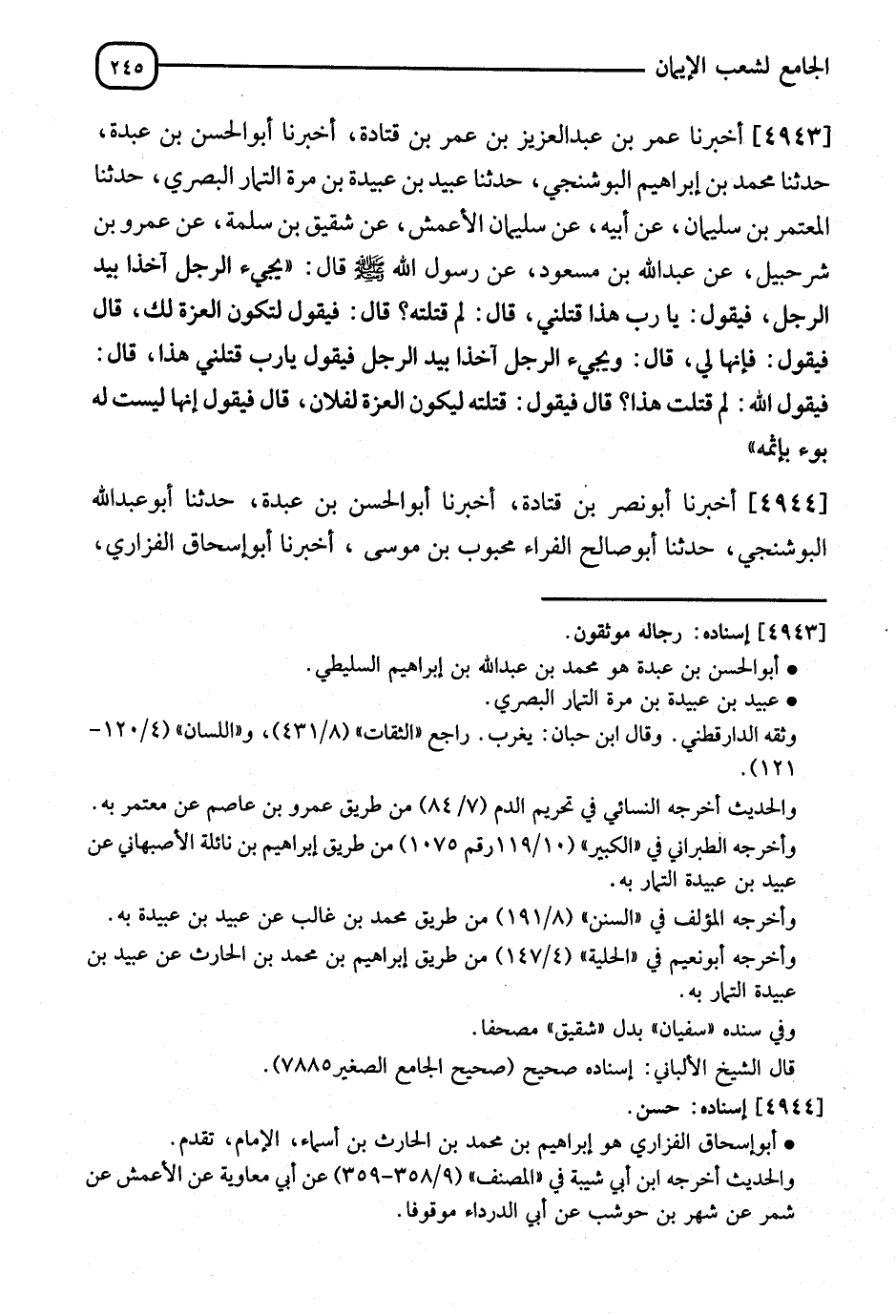 4943 - أَخْبَرَنَا عُمَرُ بْنُ عَبْدِ الْعَزِيزِ بْنِ عُمَرَ بْنِ قَتَادَةَ، أنا أَبُو الْحَسَنِ بْنُ عَبْدَةَ، ثنا مُحَمَّدُ بْنُ إِبْرَاهِيمَ الْبُوشَنْجِيُّ، ثنا عُبَيْدُ بْنُ عُبَيْدَةَ بْنِ مُرَّةَ التَّمَّارُ الْبَصْرِيُّ، ثنا الْمُعْتَمِرُ بْنُ سُلَيْمَانَ، عَنْ أَبِيهِ، عَنْ سُلَيْمَانَ الْأَعْمَشِ، عَنْ شَقِيقِ بْنِ سَلَمَةَ، عَنْ عَمْرِو بْنِ شُرَحْبِيلٍ، عَنْ عَبْدِ اللهِ بْنِ مَسْعُودٍ، عَنْ رَسُولِ اللهِ صَلَّى اللَّهُ عَلَيْهِ وَسَلَّمَ قَالَ: " يَجِيءُ الرَّجُلُ آخِذًا بَيَدِ الرَّجُلِ فَيَقُولُ: يَا رَبِّ هَذَا قَتَلَنِي، قَالَ: §لِمَ قَتَلْتَهُ؟ قَالَ: فَيَقُولُ: لِتَكُونَ الْعِزَّةُ لَكَ، قَالَ: فَيَقُولُ: فَإِنَّهَا لِي، قَالَ: وَيَجِيءُ الرَّجُلُ آخِذًا بَيَدِ الرَّجُلِ فَيَقُولُ: يَا رَبِّ قَتَلَنِي هَذَا، قَالَ: فَيَقُولُ اللهُ: لِمَ قَتَلْتَ هَذَا؟ قَالَ: فَيَقُولُ: قَتَلْتُهُ لِتَكُونَ الْعِزَّةَ لِفُلَانٍ، قَالَ: فَيَقُولُ: إِنَّهَا لَيْسَتْ لَهُ، بُؤْ بِإِثْمِهِ "