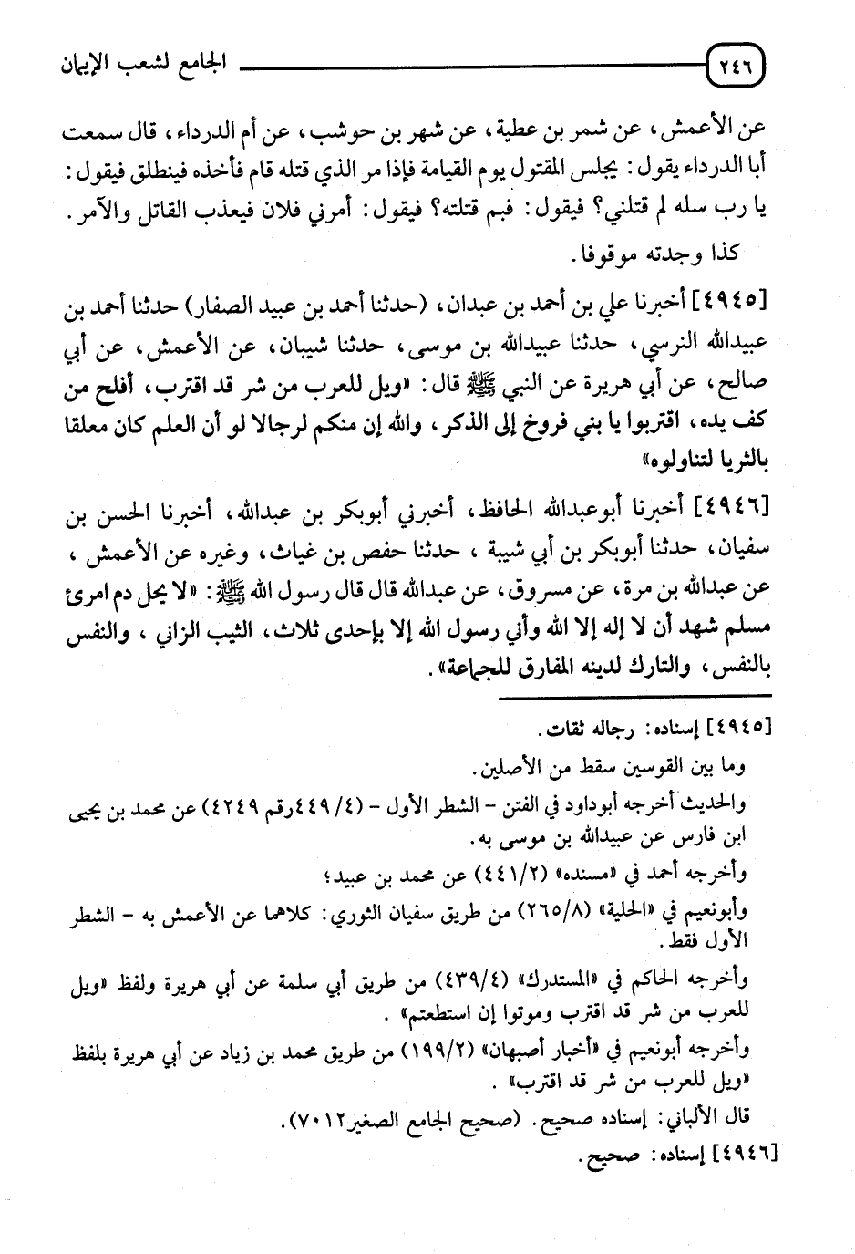 4945 - أَخْبَرَنَا عَلِيُّ بْنُ أَحْمَدَ بْنِ عَبْدِانَ، ثنا أَحْمَدُ بْنُ عُبَيْدِ اللهِ الرَّقِّيُّ، ثنا عُبَيْدُ اللهِ بْنُ مُوسَى، ثنا شَيْبَانُ، عَنِ الْأَعْمَشِ، عَنْ أَبِي صَالِحٍ، عَنْ أَبِي هُرَيْرَةَ، عَنِ النَّبِيِّ صَلَّى اللَّهُ عَلَيْهِ وَسَلَّمَ قَالَ: " §وَيْلٌ لِلْعَرَبِ مِنْ شَرٍّ قَدِ اقْتَرَبَ، أَفْلَحَ مَنْ كَفَّ يَدَهُ، اقْتَرِبُوا يَا بَنِي فَرُّوخٍ إِلَى الذِّكْرِ، وَاللهِ إِنَّ مِنْكُمْ لَرِجَالًا لَوْ أَنَّ الْعِلْمَ كَانَ مُعَلَّقًا بِالثُّرَيَّا لَتَنَاوَلُوهُ "
