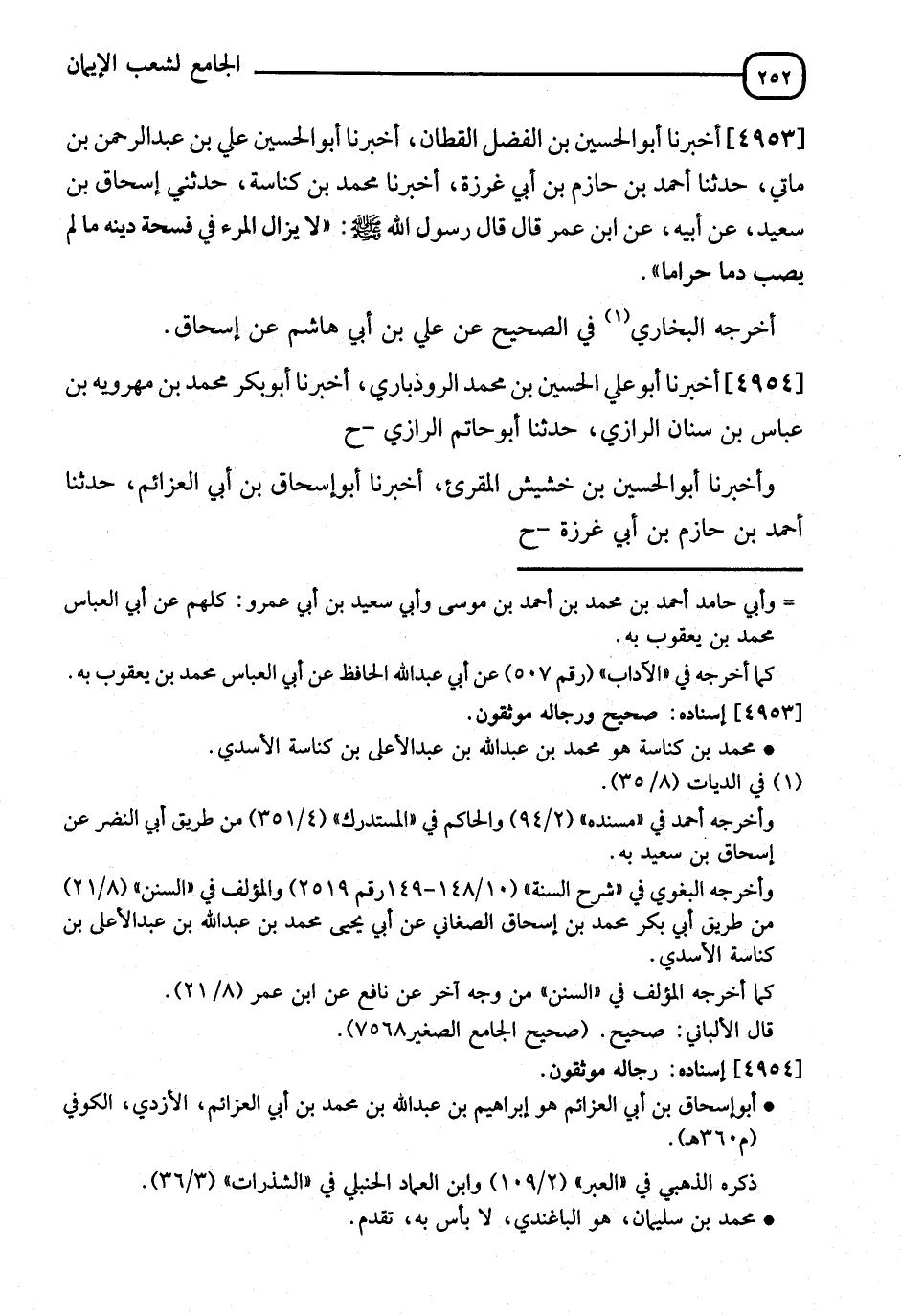4953 - أَخْبَرَنَا أَبُو الْحَسَنِ بْنُ الْفَضْلِ الْقَطَّانُ، أنا أَبُو الْحُسَيْنِ عَلِيُّ بْنُ عَبْدِ الرَّحْمَنِ بْنِ مَانِي، ثنا أَحْمَدُ بْنُ حَازِمِ بْنِ أَبِي عِزْوَةَ، أنا مُحَمَّدُ بْنُ كُنَاسَةَ، حَدَّثَنِي إِسْحَاقُ بْنُ سَعِيدٍ، عَنْ أَبِيهِ، عَنِ ابْنِ عُمَرَ، قَالَ: قَالَ رَسُولُ اللهِ صَلَّى اللَّهُ عَلَيْهِ وَسَلَّمَ: §" لَا يَزَالُ الْمَرْءُ فِي فُسْحَةٍ مِنْ دِينِهِ مَا لَمْ يُصِبْ دَمًا حَرَامًا ". أَخْرَجَهُ الْبُخَارِيُّ فِي الصَّحِيحِ، عَنْ عَلِيِّ بْنِ أَبِي هَاشِمٍ، عَنْ إِسْحَاقَ