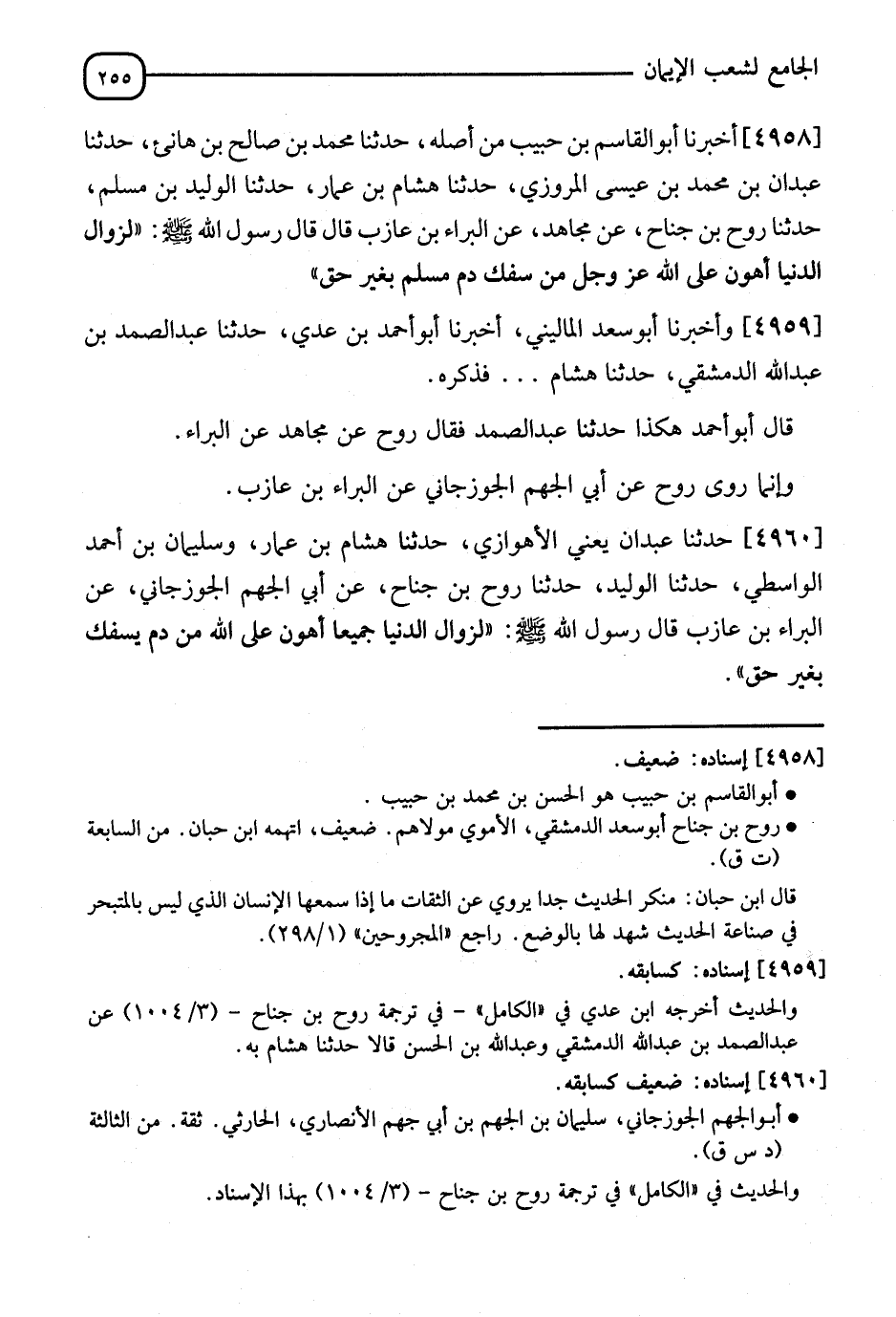 4960 - ثَنَاهُ عَبْدَانُ يَعْنِي الْأَهْوَازِيَّ، ثنا هِشَامُ بْنُ عَمَّارٍ، وَسُلَيْمَانُ بْنُ أَحْمَدَ الْوَاسِطِيُّ، ثنا الْوَلِيدُ، ثنا رَوْحُ بْنُ جَنَاحٍ، عَنْ أَبِي الْجَهْمِ الْجُوزَجَانِيِّ، أَنَّ الْبَرَاءَ بْنَ عَازِبٍ، قَالَ رَسُولُ اللهِ صَلَّى اللَّهُ عَلَيْهِ وَسَلَّمَ: §" لَزَوَالُ الدُّنْيَا جَمِيعًا أَهْوَنُ عَلَى اللهِ مِنْ دَمٍ يُسْفَكُ بِغَيْرِ حَقٍّ "