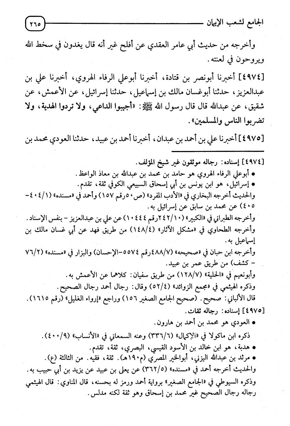 4974 - أَخْبَرَنَا أَبُو نَصْرِ بْنُ قَتَادَةَ، أنا أَبُو عَلِيٍّ الرَّفَّاءُ الْقَرَوِيُّ، أنا عَلِيُّ بْنُ عَبْدِ الْعَزِيزِ، ثنا أَبُو غَسَّانَ مَالِكُ بْنُ إِسْمَاعِيلَ، ثنا إِسْرَائِيلُ، عَنِ الْأَعْمَشِ، عَنْ شَقِيقٍ، عَنْ عَبْدِ اللهِ، قَالَ: قَالَ رَسُولُ اللهِ صَلَّى اللَّهُ عَلَيْهِ وَسَلَّمَ: " §أَجِيبُوا الدَّاعِيَ، وَلَا تَرُدُّوا الْهَدِيَّةَ، وَلَا تَضْرِبُوا النَّاسَ أَوِ الْمُسْلِمِينَ "