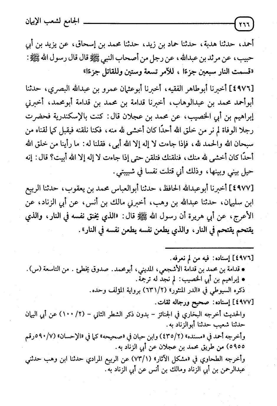 4977 - أَخْبَرَنَا أَبُو عَبْدِ اللهِ الْحَافِظُ، ثنا أَبُو الْعَبَّاسِ مُحَمَّدُ بْنُ يَعْقُوبَ، ثنا الرَّبِيعُ بْنُ سُلَيْمَانَ، ثنا عَبْدُ اللهِ بْنُ وَهْبٍ، أَخْبَرَنِي مَالِكُ بْنُ أَنَسٍ، عَنْ أَبِي الزِّنَادِ، عَنِ الْأَعْرَجِ، عَنْ أَبِي هُرَيْرَةَ، أَنَّ رَسُولَ اللهِ صَلَّى اللَّهُ عَلَيْهِ وَسَلَّمَ قَالَ: " §الَّذِي يَخْنُقُ نَفْسَهُ يَخْنُقُ نَفْسَهُ فِي النَّارِ، وَالَّذِي يَقْتَحِمُ يَقْتَحِمُ فِي النَّارِ، وَالَّذِي يَطْعَنُ نَفْسَهُ يَطْعُنُ نَفْسَهُ فِي النَّارِ "