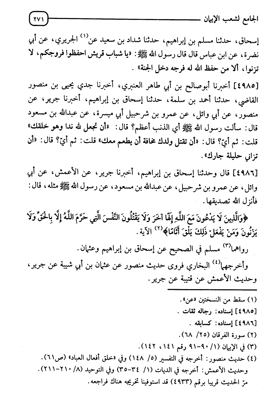 4986 - قَالَ: وَثَنا إِسْحَاقُ بْنُ إِبْرَاهِيمَ، أنا جَرِيرٌ، عَنِ الْأَعْمَشِ، عَنْ أَبِي وَائِلٍ، عَنْ عَمْرِو بْنِ شُرَحْبِيلٍ، عَنْ عَبْدِ اللهِ بْنِ مَسْعُودٍ، عَنْ رَسُولِ اللهِ صَلَّى اللَّهُ عَلَيْهِ وَسَلَّمَ مِثْلَهُ. قَالَ: " فَأَنْزَلَ اللهُ تَصْدِيقَهَا {وَالَّذِينَ لَا يَدْعُونَ مَعَ اللهِ إِلَهًا آخَرَ وَلَا يَقْتُلُونَ النَّفْسَ الَّتِي حَرَّمَ اللهُ إِلَّا بِالْحَقِّ وَلَا يَزْنُونَ وَمَنْ يَفْعَلْ ذَلِكَ يَلْقَ أَثَامًا} [الفرقان: 68] الْآيَةَ. رَوَاهُمَا مُسْلِمٌ فِي الصَّحِيحِ، عَنْ إِسْحَاقَ بْنِ إِبْرَاهِيمَ، وَعُثْمَانَ. وَأَخْرَجَهُمَا الْبُخَارِيُّ، فَرَوَى حَدِيثَ مَنْصُورٍ، عَنْ عُثْمَانَ بْنِ أَبِي شَيْبَةَ، عَنْ جَرِيرٍ، وَحَدِيثِ الْأَعْمَشِ، عَنْ قُتَيْبَةَ، عَنْ جَرِيرٍ. -[272]-