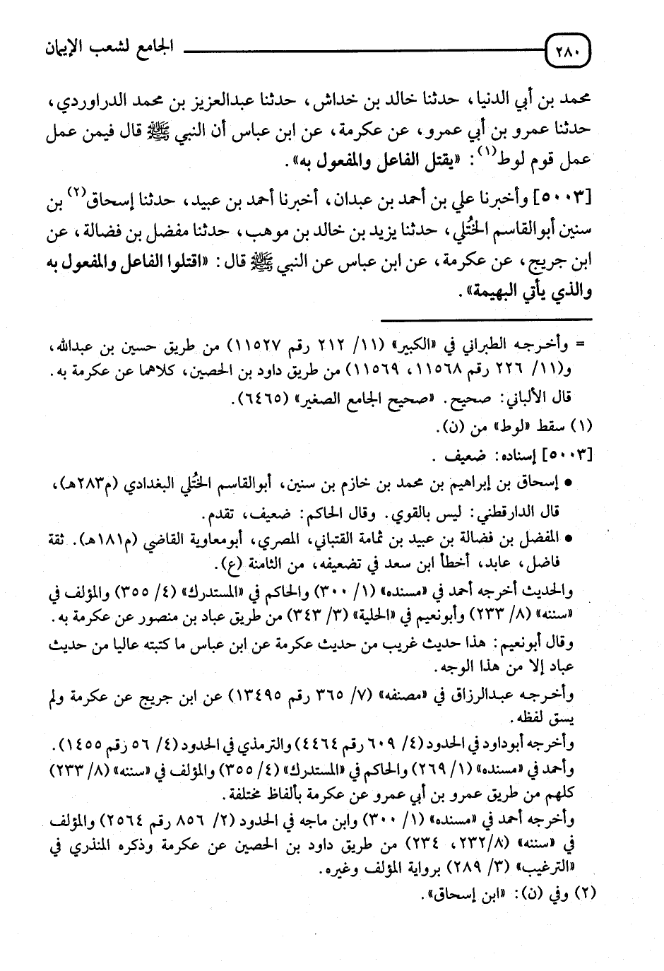 5003 - وَأَخْبَرَنَا عَلِيُّ بْنُ أَحْمَدَ بْنُ عَبْدَانَ، ثنا أَحْمَدُ بْنُ عُبَيْدٍ، ثنا إِسْحَاقُ بْنُ سِنِينَ أَبُو الْقَاسِمِ الْحُلِيُّ، ثنا يَزِيدُ بْنُ خَالِدِ بْنِ مَوْهَبٍ، ثنا مُفَضَّلُ بْنُ فَضَالَةَ، عَنِ ابْنِ جُرَيْجٍ، عَنْ عِكْرِمَةَ، عَنِ ابْنِ عَبَّاسٍ، عَنِ النَّبِيِّ صَلَّى اللَّهُ عَلَيْهِ وَسَلَّمَ قَالَ: " §اقْتُلُوا الْفَاعِلَ وَالْمَفْعُولَ بِهِ، وَالَّذِي يَأْتِي الْبَهِيمَةَ ". -[281]- قَالَ ابْنُ جُرَيْجٍ: وَكَانَ عَطَاءُ بْنُ أَبِي رَبَاحٍ، وَسَعِيدُ بْنُ الْمُسَيِّبِ، يَقُولَانَ: " الْفَاعِلُ وَالْمَفْعُولُ بِهِ يَعْنِي يُحَدَّانِ حَدَّ الزِّنَا "